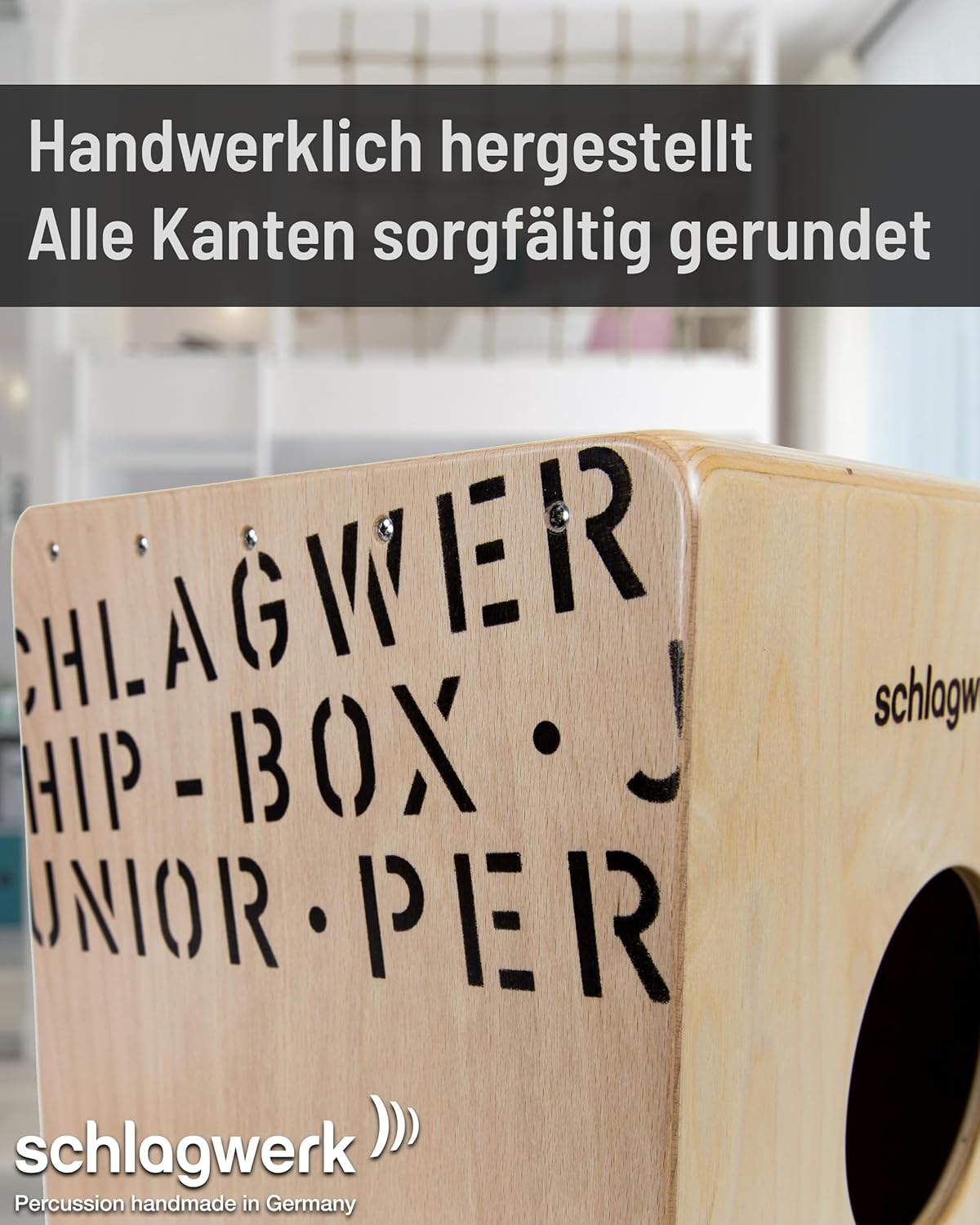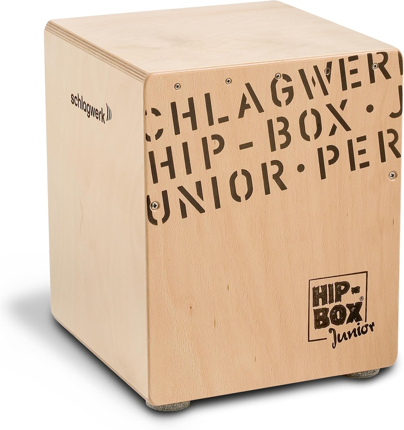PRODUKTBESCHREIBUNGEN SCHLAGWERK CP-401 Schlagwerk HipBox Junior Cajon Der Clou: die Hip-Box kann nicht nur im Sitzen gespielt werden: Auf der Rückseite liegend, können mehrere 'Drummer' gleichzeitig auf der Cajon spielen. Aber Vorsicht: Dies ist kein Kinderspielzeug - der fette Bass und der prägnante Snareeffekt wird jeden professionellen Percussionisten begeistern. Die Features des Schlagwerk HipBox Junior Cajon CP 401 Hip-Box Junior Cajon Schlagfläche: Buche Korpus: 8 Lagen Birke, ca. 30 x 30 x 36 cm Snareeffekt