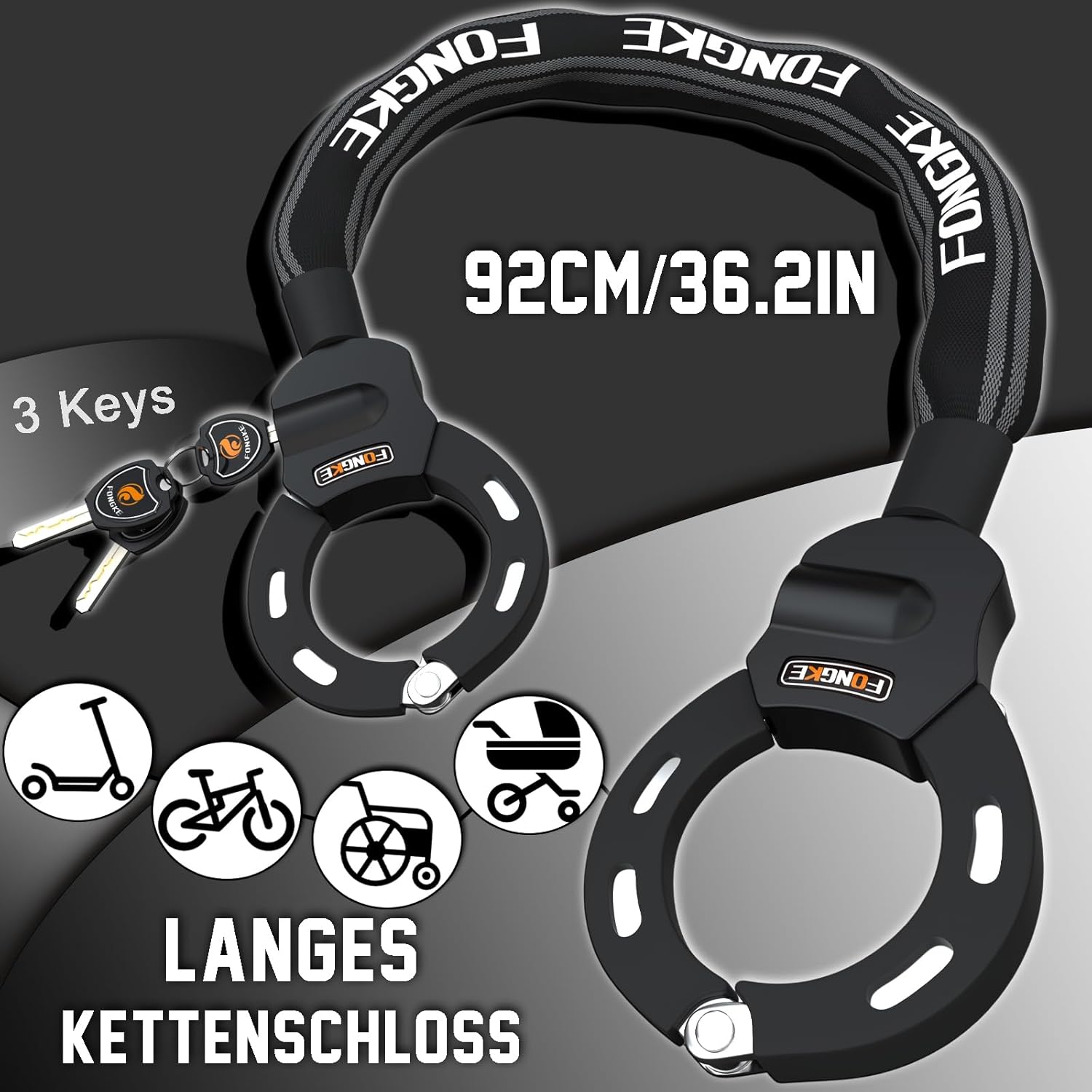 • Weithin Verwendet: Das Elektro-Scooter-Schloss kann verwendet werden, um Ihren Roller sowie Fahrräder, E-Bikes, Leitern, Balance-Bikes und andere Gegenstände zu sperren, die an Zaunpfosten befestigt werden können.