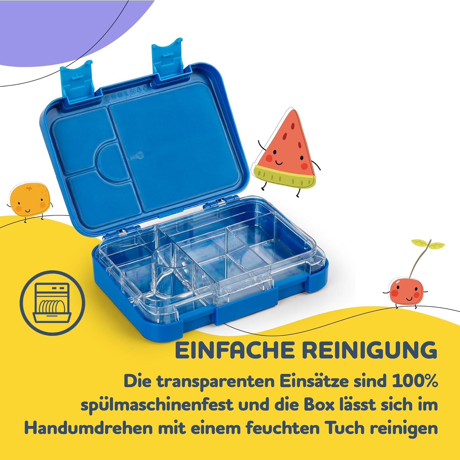 - đ KEIN DURCHWEICHTES PAUSENBROT - Die Dichtungen im Deckel unserer fröhlichen Brotdose mit FĂ€chern verhindern, dass feuchte Lebensmittel auslaufen. Alle Teile der junior Vesperbox können ausserdem problemlos herausgenommen und separat in der SpĂŒlmaschine gereinigt werden.