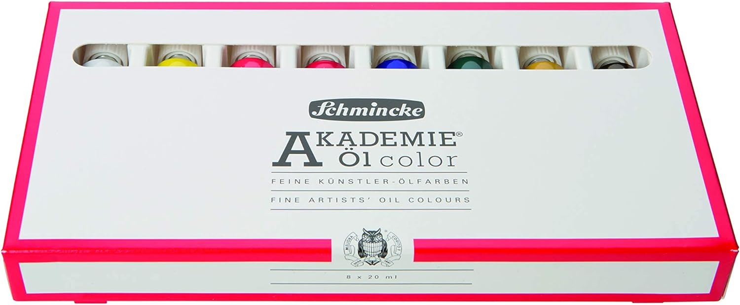 - 🎨 AKADEMIE Öl color kleines Karton-Set mit 8 Tuben à 20 ml, Grundsortiment feiner Ölfarben in Schmincke Qualität (L x B x H 23,5 x 21,1 x 2,6 cm). Die Farbauswahl ist ausgewählt zum direkten Malen sowie zum Mischen vieler weiterer brillanter