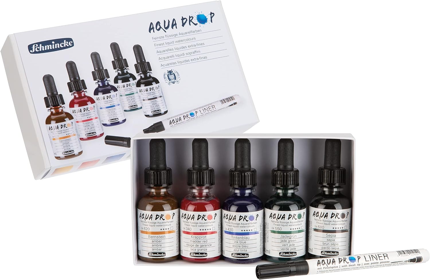 - 🎨 AQUA DROP Karton-Set mit 5 lasierenden Farbtönen der flüssigen Aquarellfarbe AQUA DROP, einer hochlichtechten Aquarelltinte auf Pigmentbasis für alle Aquarelltechniken + einem AQUA DROP Liner (L x B x H 17 x 10 x 3,6 cm). Besondere, lasierende