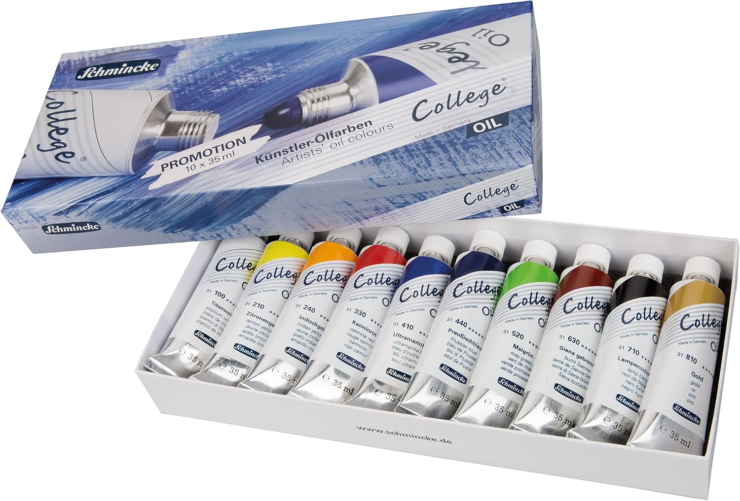 - 🎨 College Oil-Set, Einstiegskasten in die Ölmalerei, Grundsortiment mit 10 Tuben Ölfarbe in Studienqualität à 35 ml, Kartonset (L x B x H: 25,5 x 11 x 3,5 cm). Die Farbauswahl ermöglicht ein direktes Malen in Öl, aber auch eine Vielzahl von