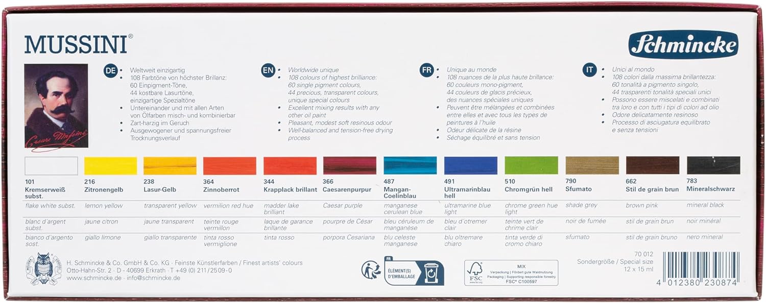 - 🎨 MUSSINI: Kartonset mit 12 x 15 ml Tuben feinster Künstler-Harz-Ölfarbe. Set mit ausgewogener Coloristik, ideal, um sich von der feinsten MUSSINI-Qualität zu überzeugen. Der kasten ist auch ein idealesGeschenkset für anspruchsvolle Ölmaler.