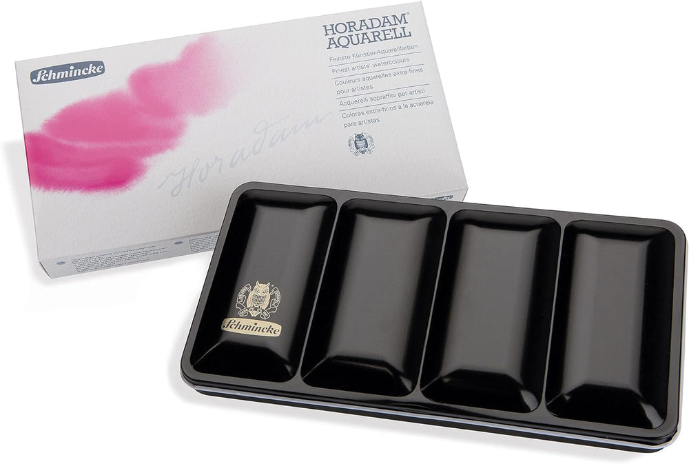 - 🎨 AQUARELLFARBEN SET: Der HORADAM AQUARELL-Kasten von Schmincke besteht aus einem stabilen Metallkasten (L x B x H: 23,1 x 11,5 x 3 cm) mit 18 coloristisch ausgewählten Farben, einer Leerschiene zur individuellen Bestückung mit 6 weiteren ganzen