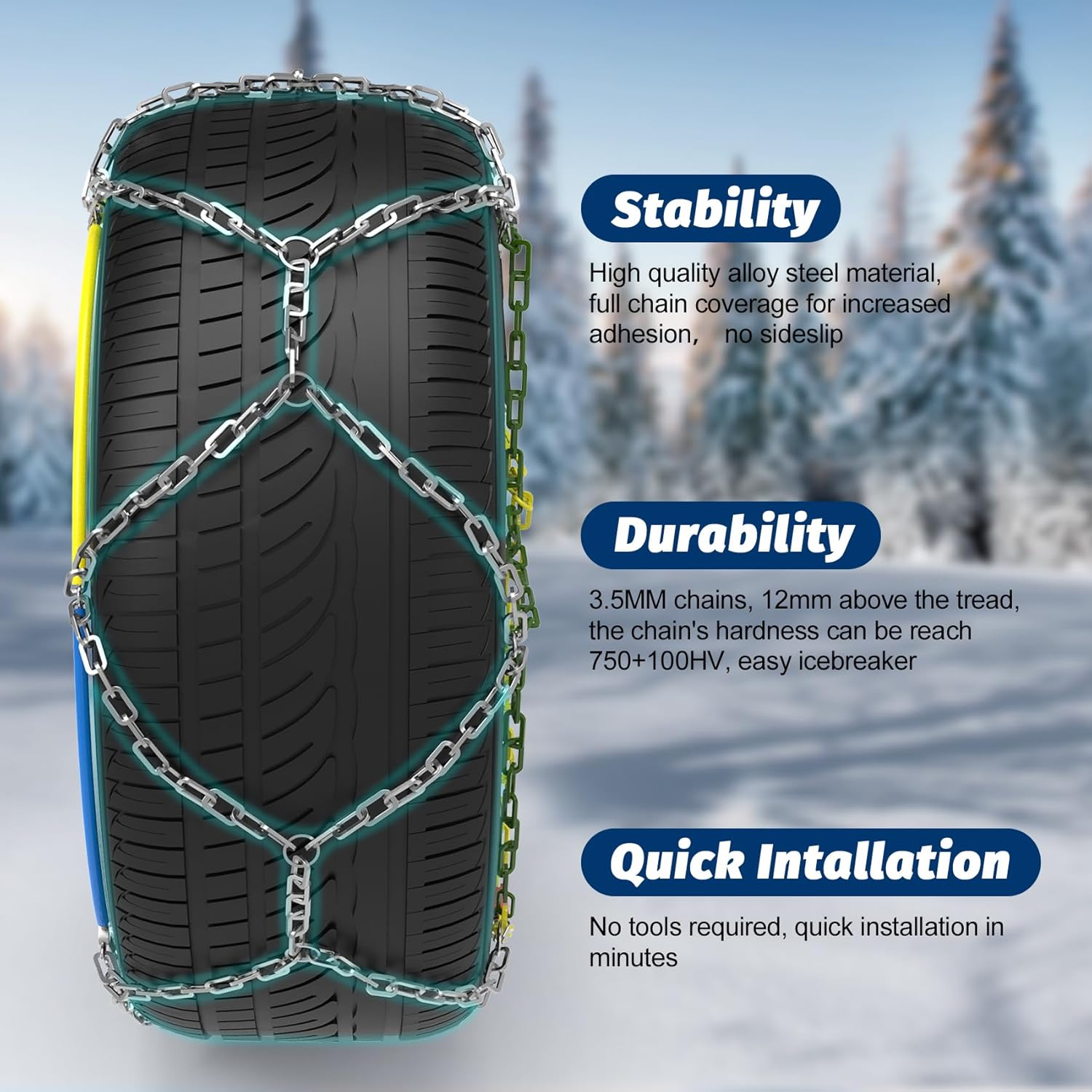 • 【Stabiles Paar Schneeketten】Made of high quality alloy steel and With tensioner and Chain width 12MM, wire diameter D3. 5MM, die haltbarer ist als TPU-Kunststoff. Die Oberfläche der Kette ist nahtlos geschweisst und galvanisch beschichtet, die