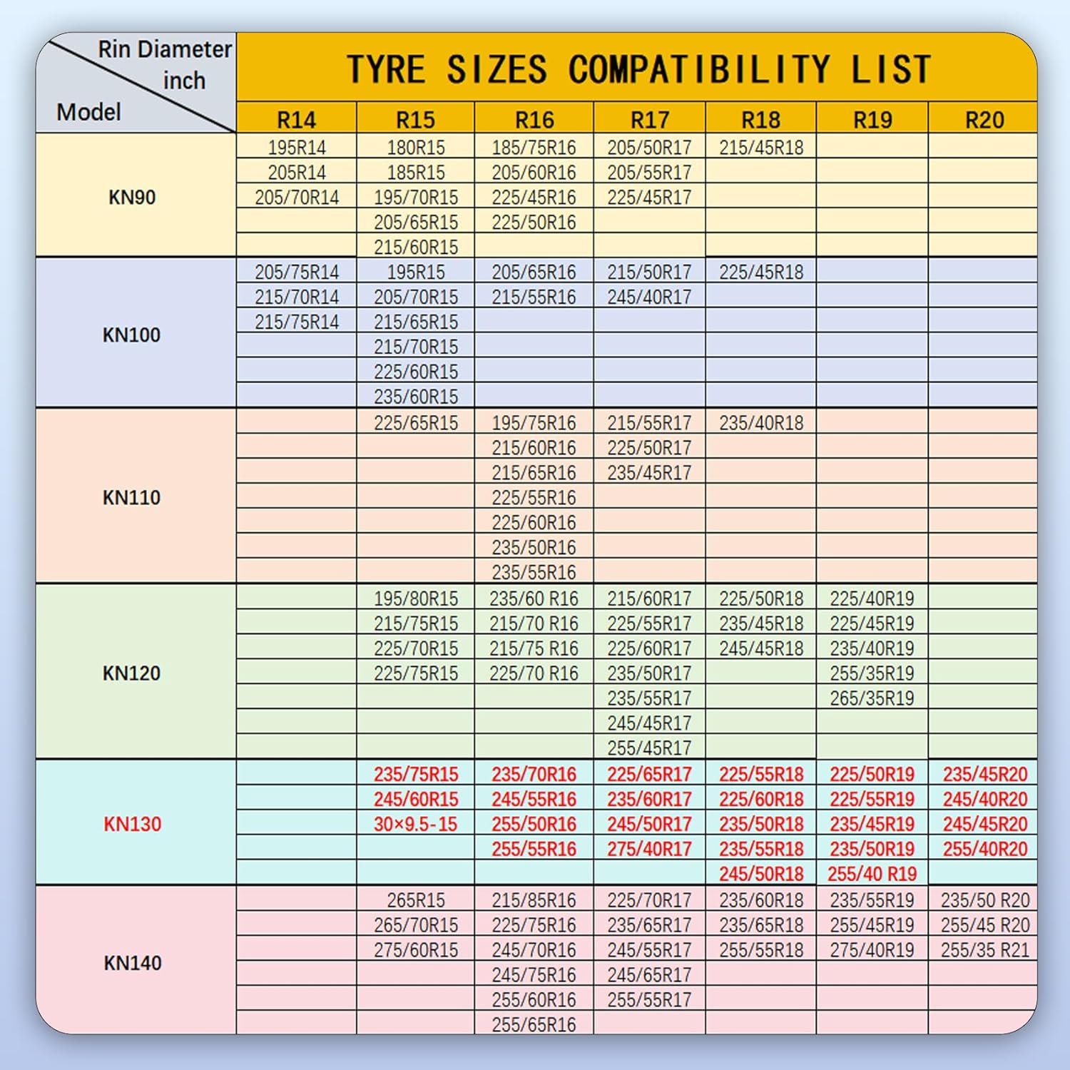 • 【Kompatibel mit】Modell KN130 Schneekette ist kompatibel mit Modell: 245/60R15, 245/55R16, 255/50R16, 255/55R16, 225/65R17, 245/50R17, 255/45R17, 275/40R17, 225/55R18, 225/60R18, 235/55R18, 225/50R19, 225/55R19, 235/45R19, 235/50R19, 255/40 R19,