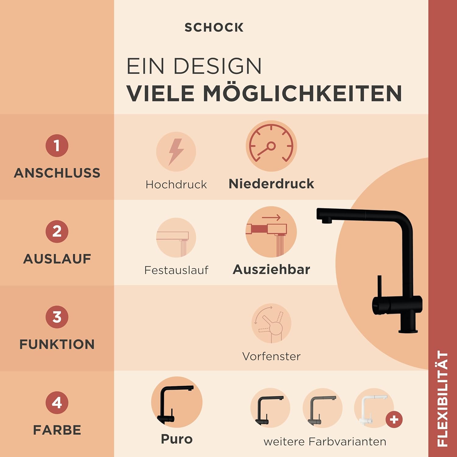 - ERGÄNZUNG: SCHOCK Küchenarmaturen sind optimal kombinierbar mit SCHOCK Spülen. Design und Funktionalität sind perfekt abgestimmt, sodass die Kombination ein stimmiges, modernes Gesamtbild ergibt