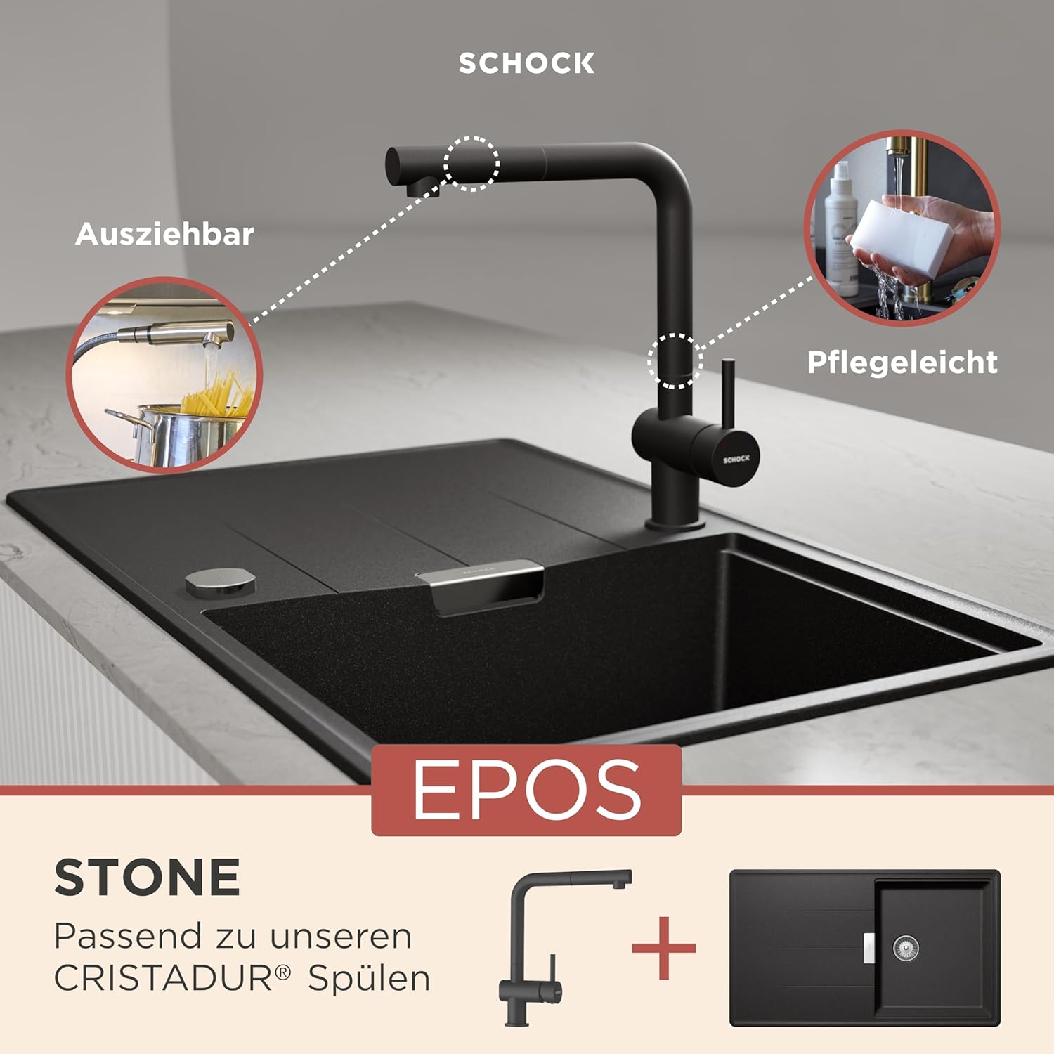 - ERGÄNZUNG: SCHOCK Küchenarmaturen sind optimal kombinierbar mit SCHOCK Spülen. Design und Funktionalität sind perfekt abgestimmt, sodass die Kombination ein stimmiges, modernes Gesamtbild ergibt