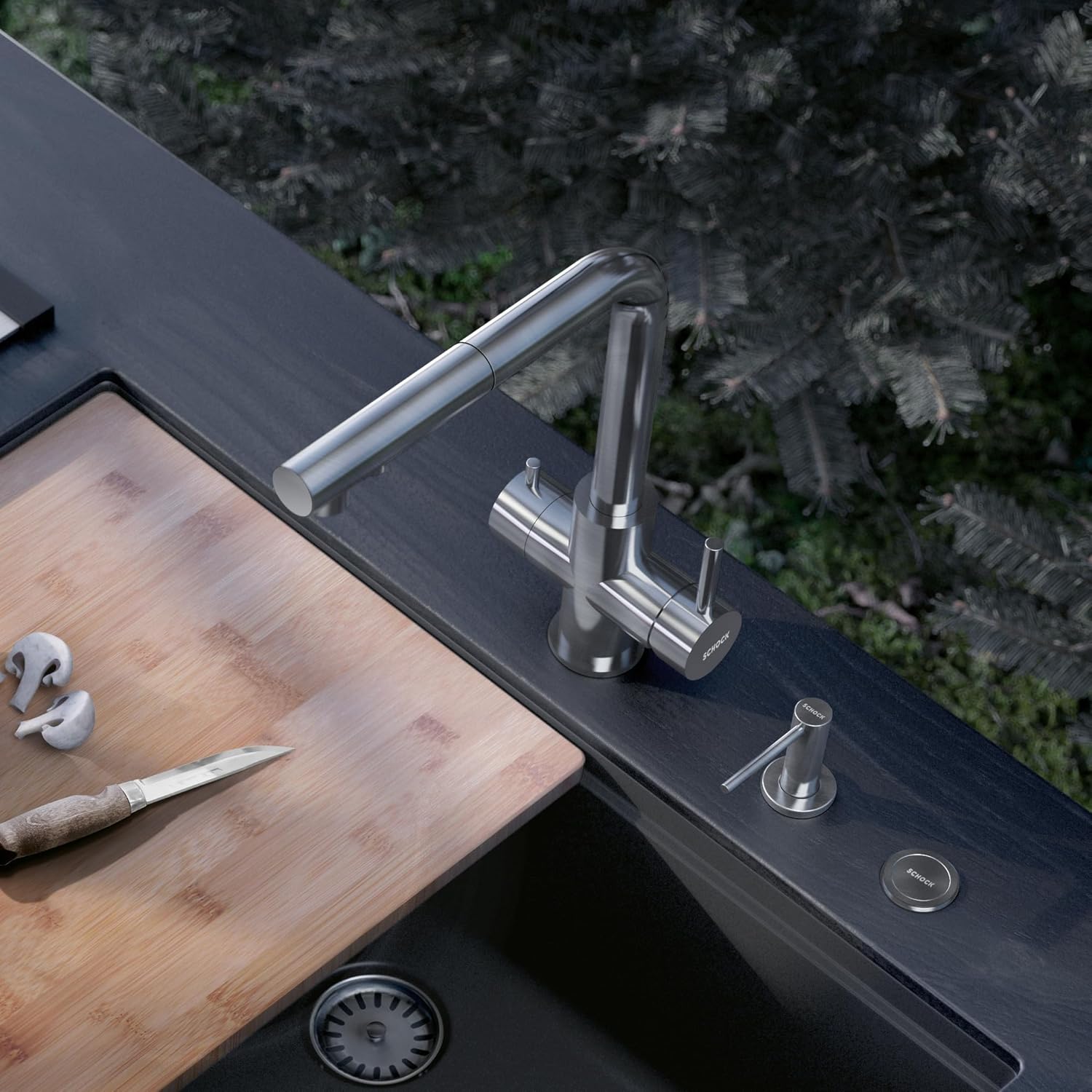 - SCHWENKBAR: Das ergonomische Design des schwenkbaren Einhebelmischers aus Edelstahl ermöglicht effizienteres Arbeiten und mehr Bewegungsfreiheit im Spülenbereich