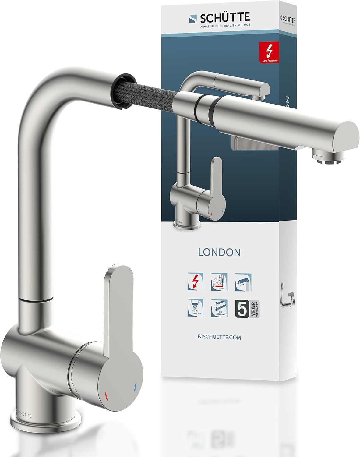 - 📦 LIEFERUMFANG: 1 x Niederdruck Küchenarmatur ausziehbar LONDON (249 x 113 x 298 mm), DVGW zertifizierte, flexible Anschlussschläuche (400 mm), 1x ausziehbare Geschirrbrause mit Schlauch (1500 mm) 1x Befestigungsdreieck für die Spüle, 1x