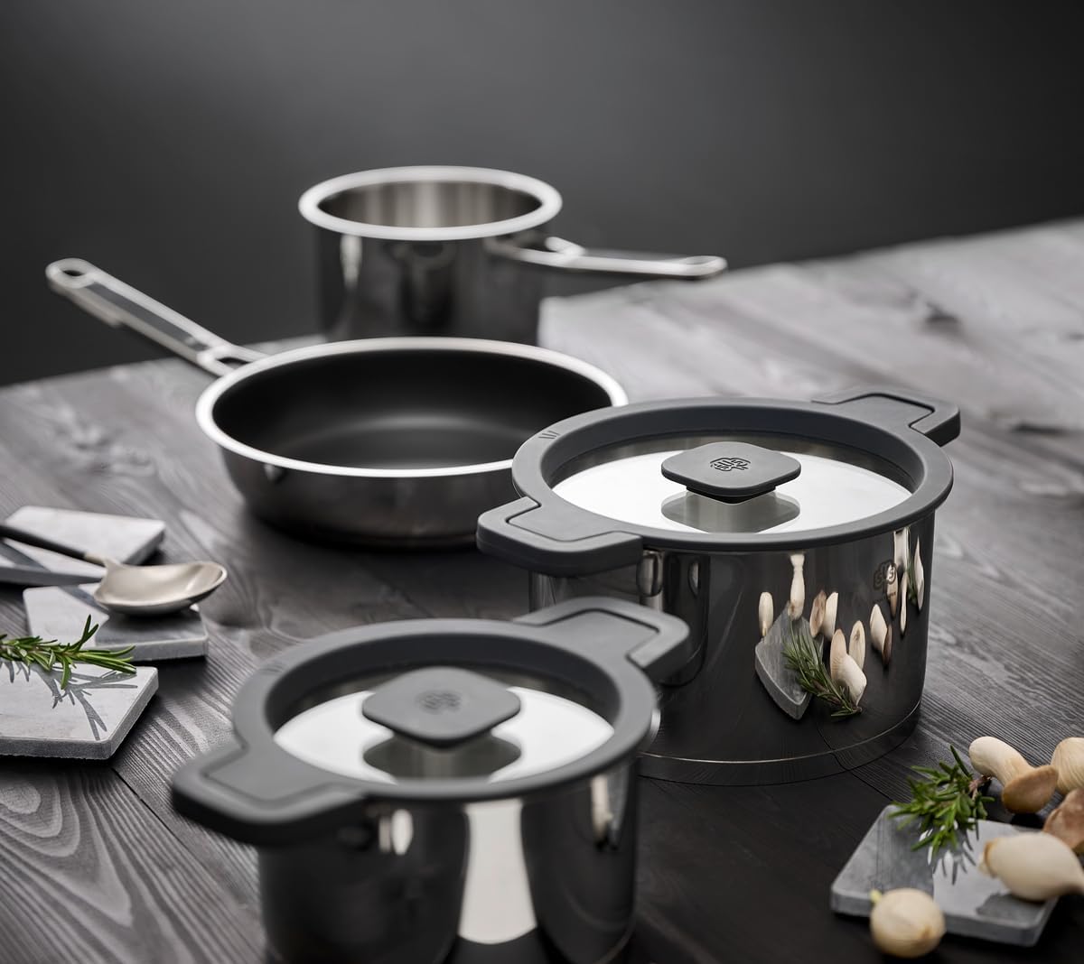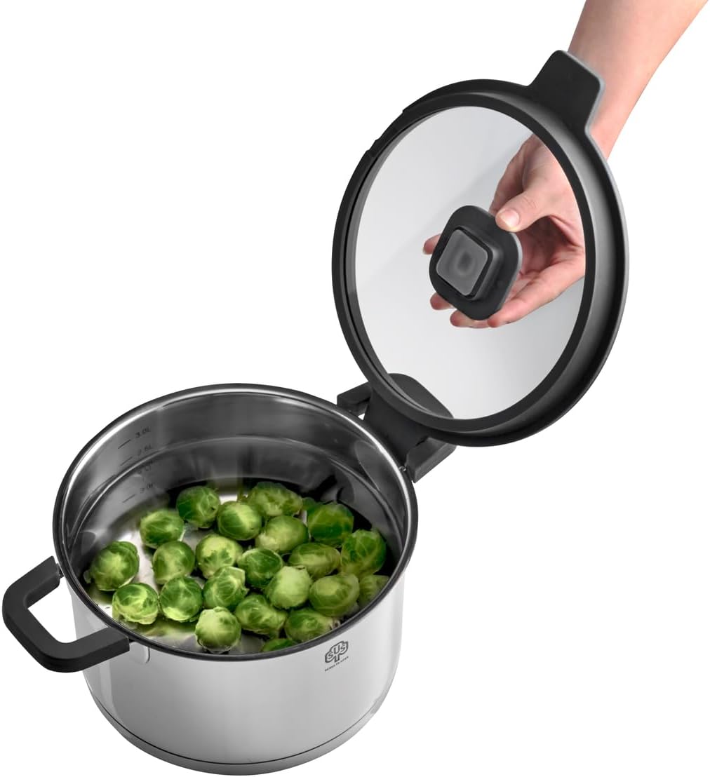 - Deckel durch flache Ausführung als Tofpuntersetzer verwendbar, Töpfe sind stapelbar