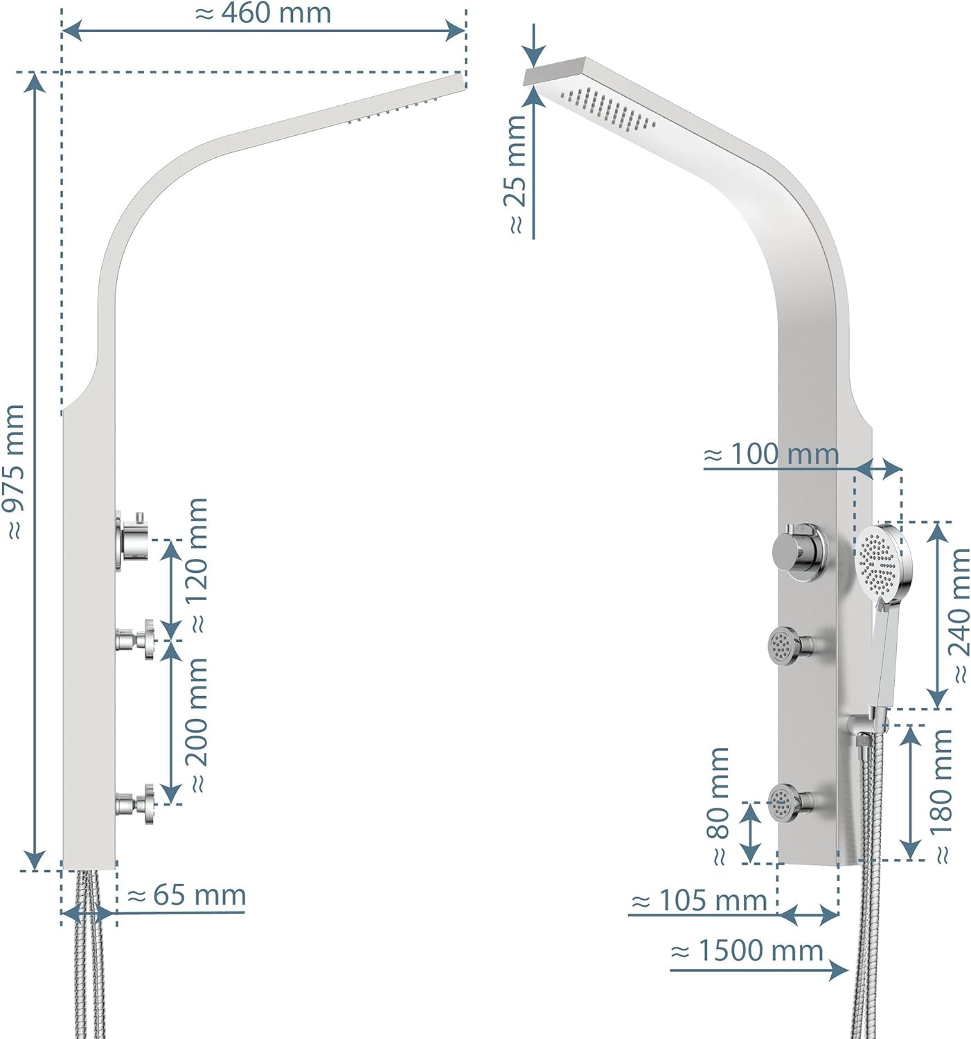 - 📦 𝐋𝐈𝐄𝐅𝐄𝐑𝐔𝐌𝐅𝐀𝐍𝐆: 1x vormontiertes Duschpaneel ohne Armatur (ca. 97, 5 cm x 10, 3 cm x 46 cm), 1x verstellbare Handbrause mit drei Strahlarten (Regen, Massage, Regenmassage), 1x Brauseschlauch für die Handbrause