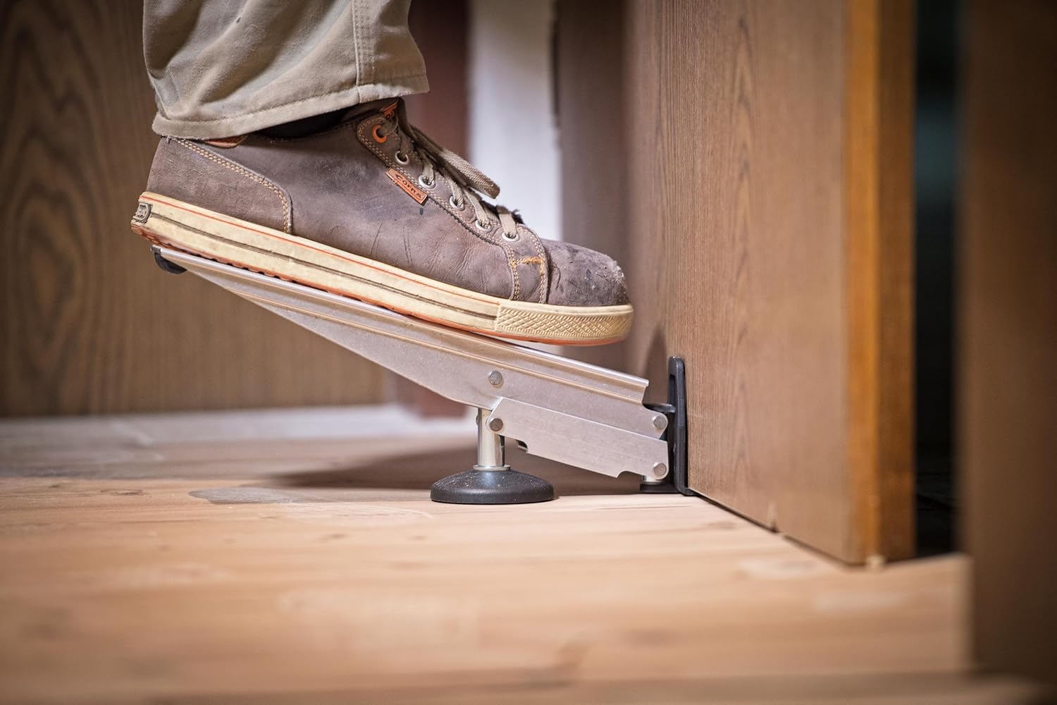 - allseitig drehbar und mit schwenkbarem Lastenwinkel für variable Anwendungen, Trittfläche mit abrutschsicherem, geriffeltem Gummibelag, standfester Gummifuss ø 100 mm