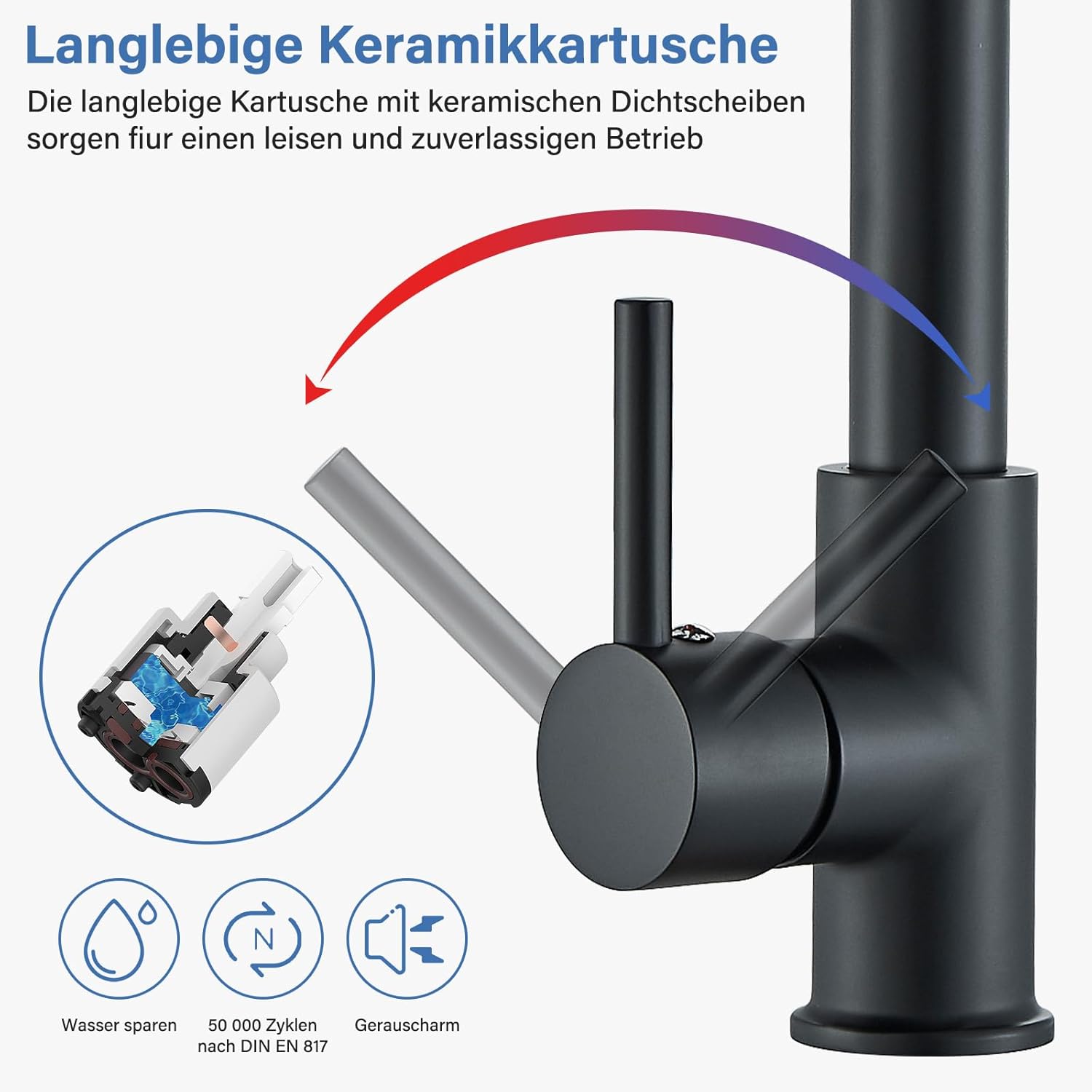 - 【Einhebel-Design】Einhebel-Design macht den mischbatterie küche einfacher, den Wasserfluss und die Temperatur zu regulieren. Spültischarmatur mit Keramik-Kartusche. Das Schalten von kaltem und warmem Wasser ist auch einwandfrei. Seitlicher