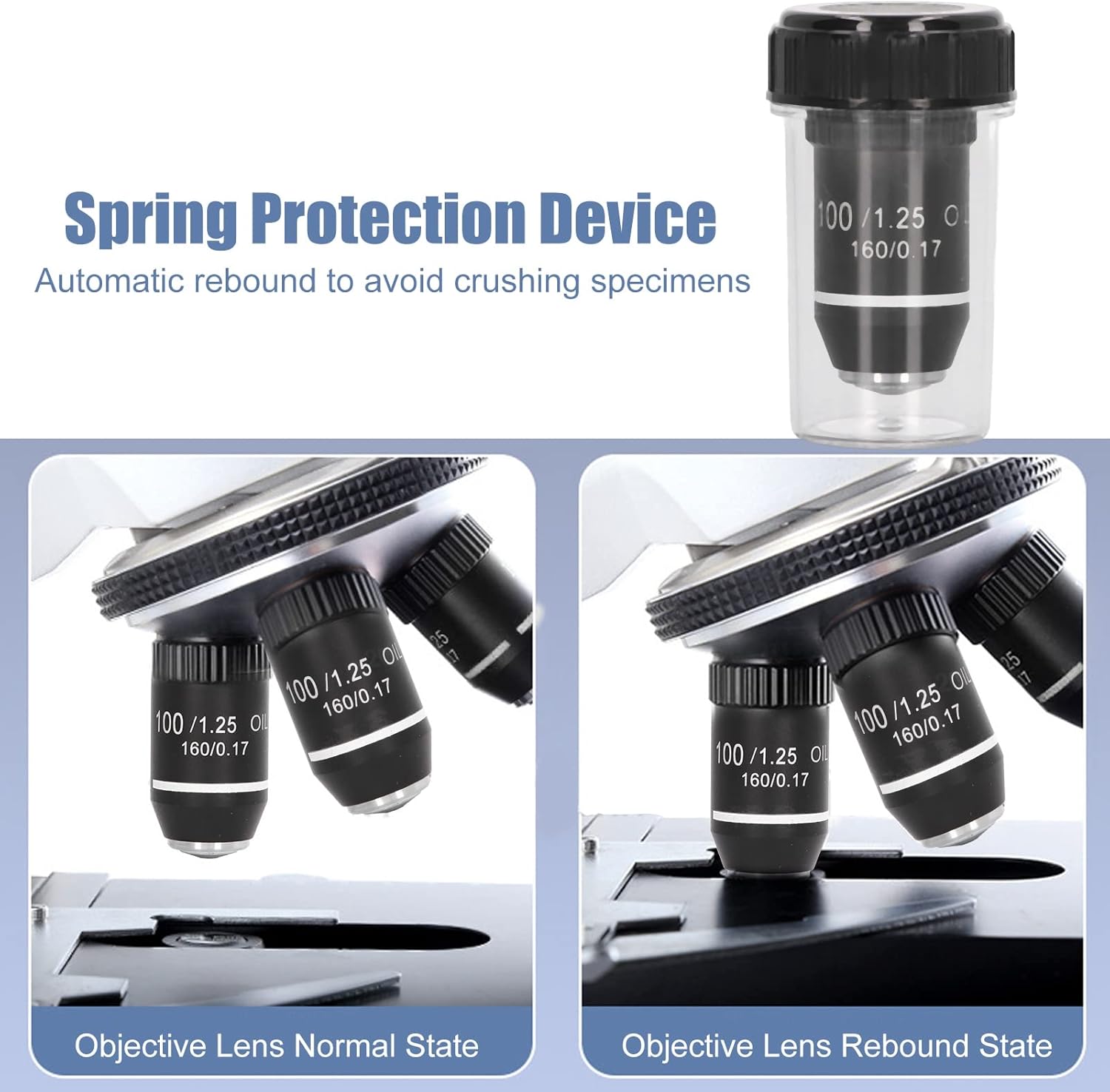 - Ausgestattet mit einer innovativen Federsicherung sorgt unser Mikroskop für die Sicherheit Ihrer Proben. Wenn während der Beobachtung versehentlich auf das Deckglas gedrückt wird, springt es automatisch zurück und verhindert so mögliche Schäden an