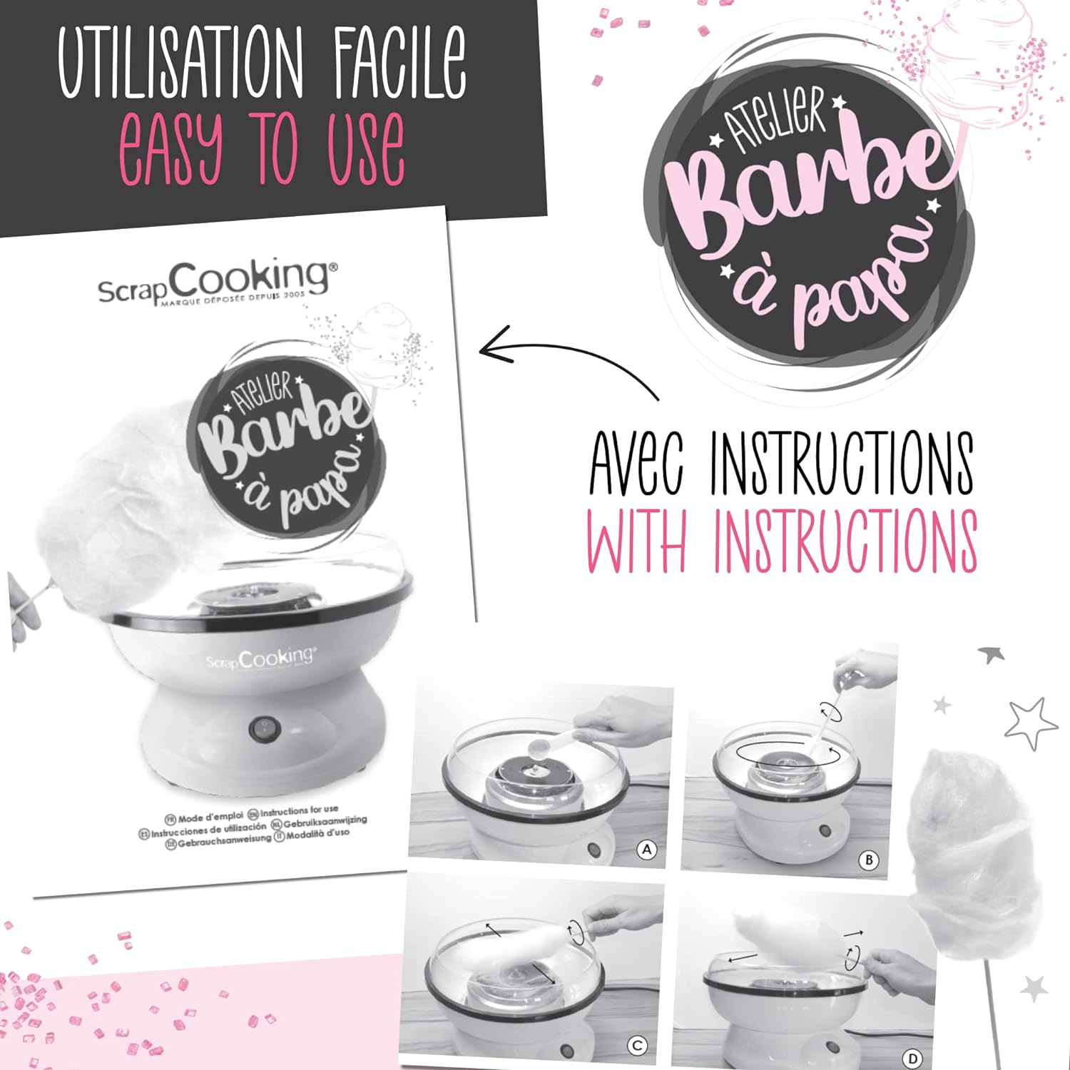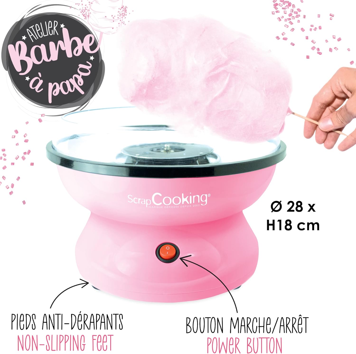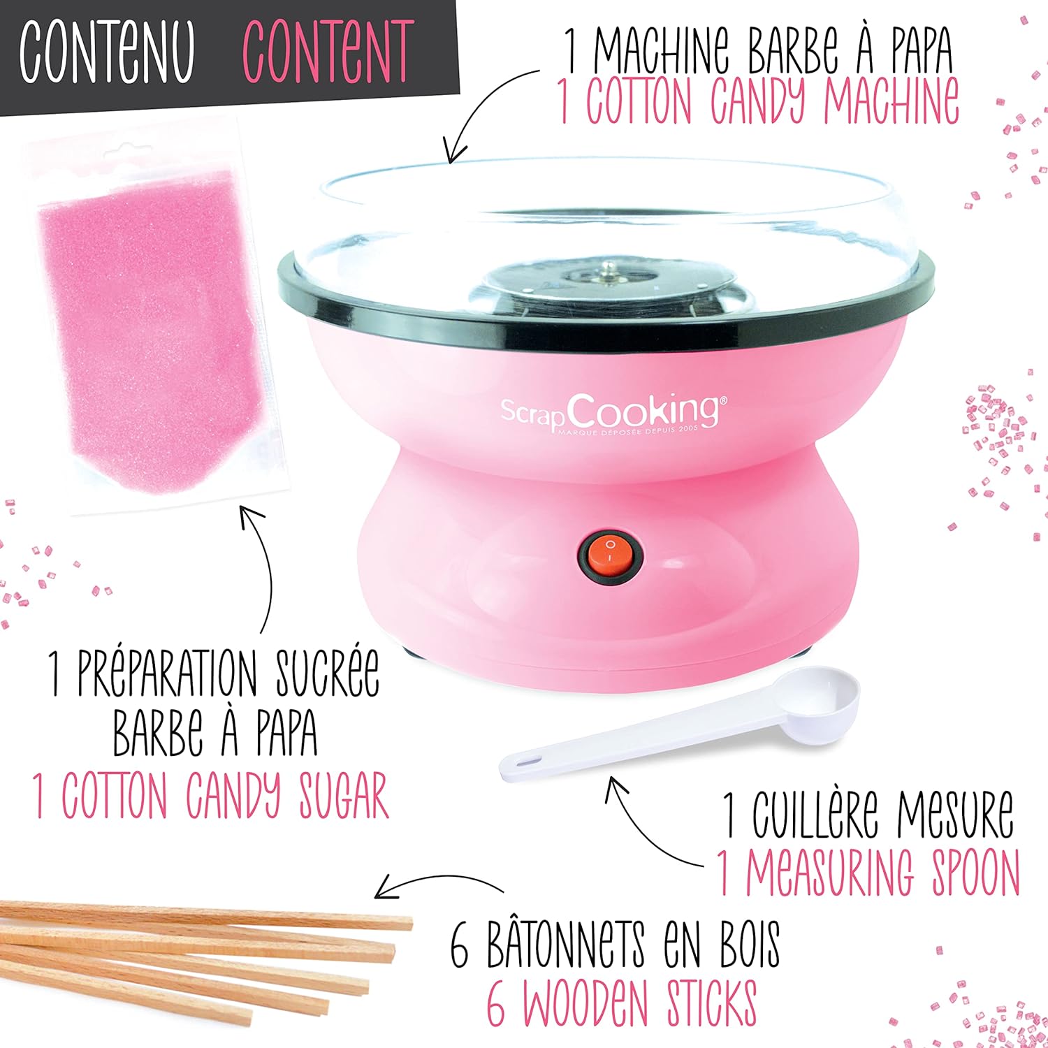 - KOMPLETT-SET - Speziell entwickeltes Gerät für köstliche Zuckerwatte im Handumdrehen. Enthält: 1 Zuckerwattemaschine, 1 Bedienungsanleitung, 1 Messlöffel, 6 wiederverwendbare Holzstäbchen und 1 Beutel rosa Zuckerwattepulver (100 g) für bis zu 12