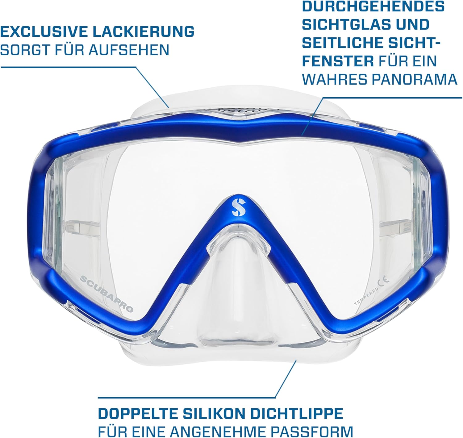- Patentiertes Maskendesign mit einem einzelnen Glas und mit seitlichen Sichtfenster