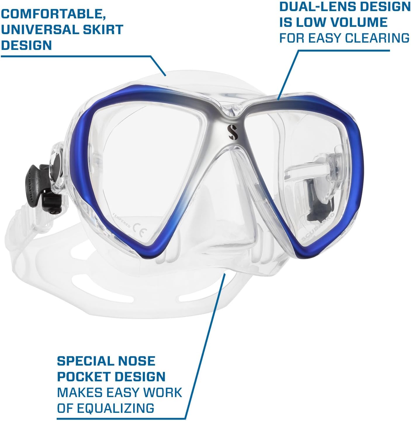 - Hartglas, weiches Silikon, gut erreichbarer Nasenerker, grosses Gesichtsfeld, leicht einstellbares Maskenband.