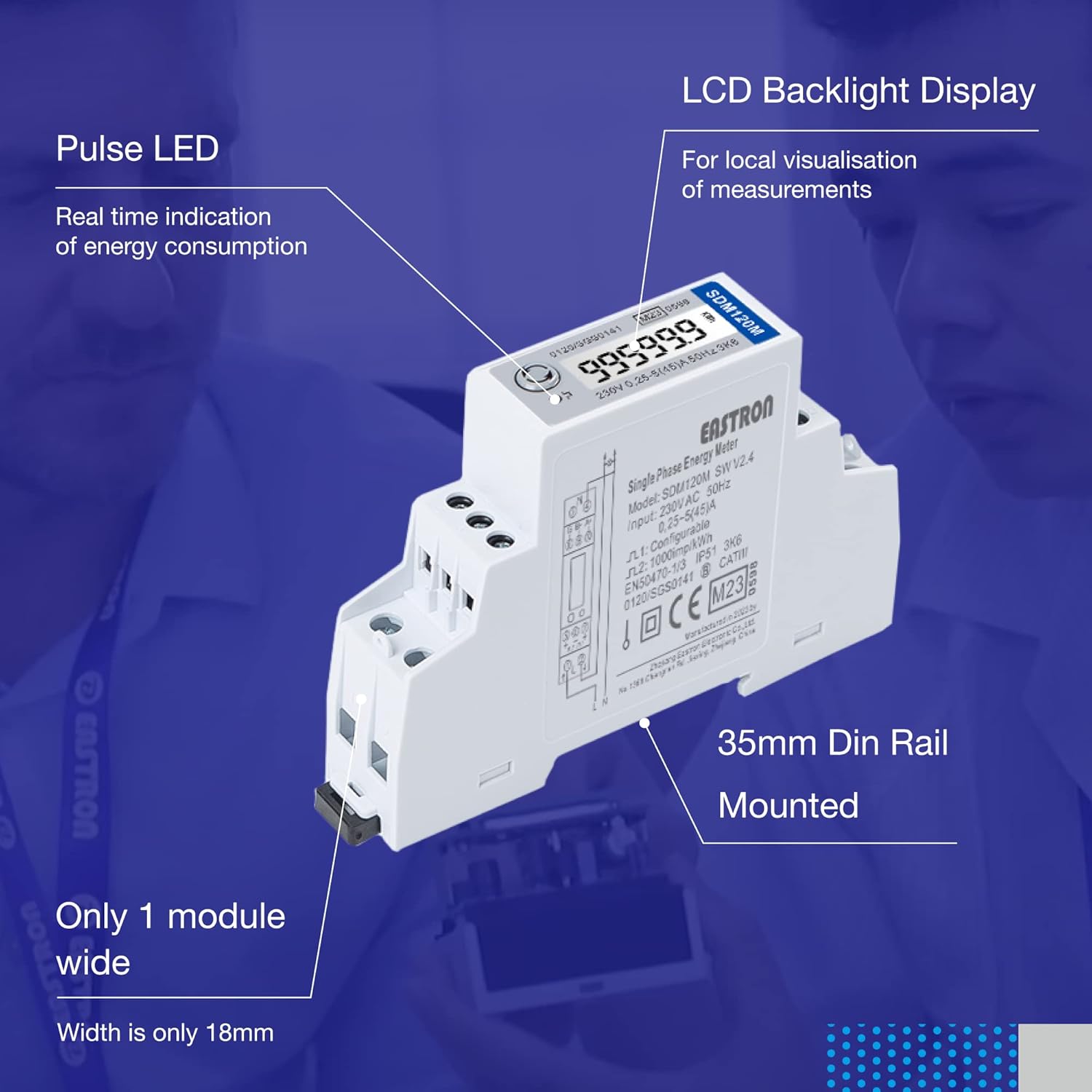 EASTRON SDM120 Stromverbrauchsmesser - einphasig - Modbus RS485 RTU - Stromzähler Hutschiene, 45A kW