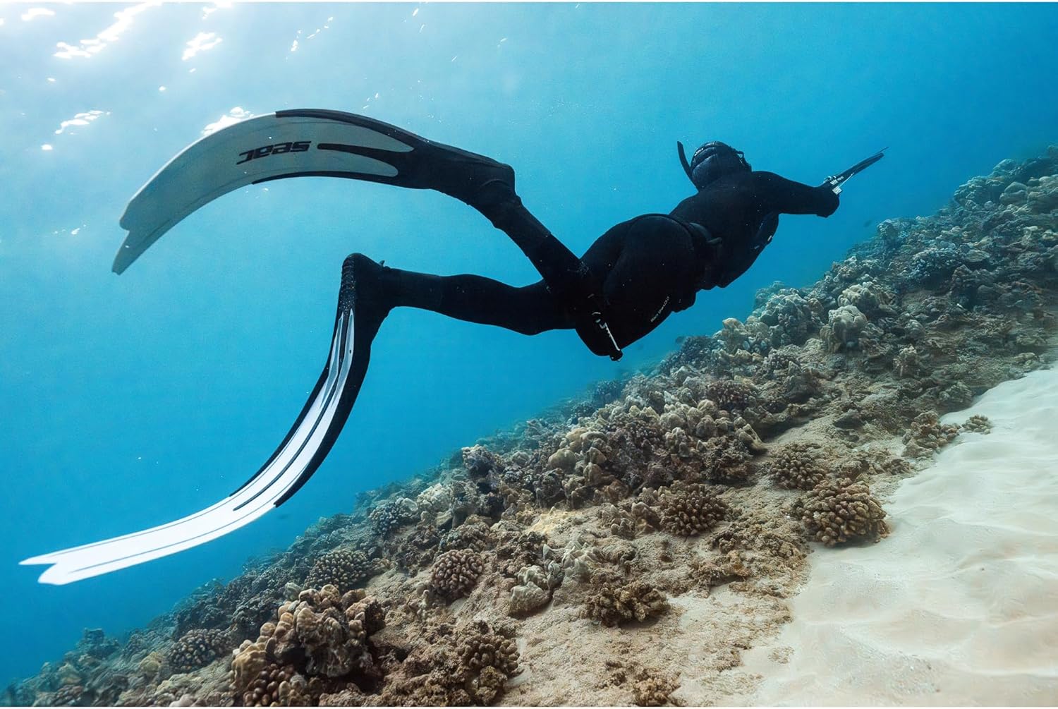 - LANGE FREITAUCHFLOSSEN: Die Flossen Seac Shout besitzen ein langes, weiches Flossenblatt mit dem anatomisch optimalen Winkel von 22°, für beste Leistungen beim Freitauchen und der Unterwasserjagd