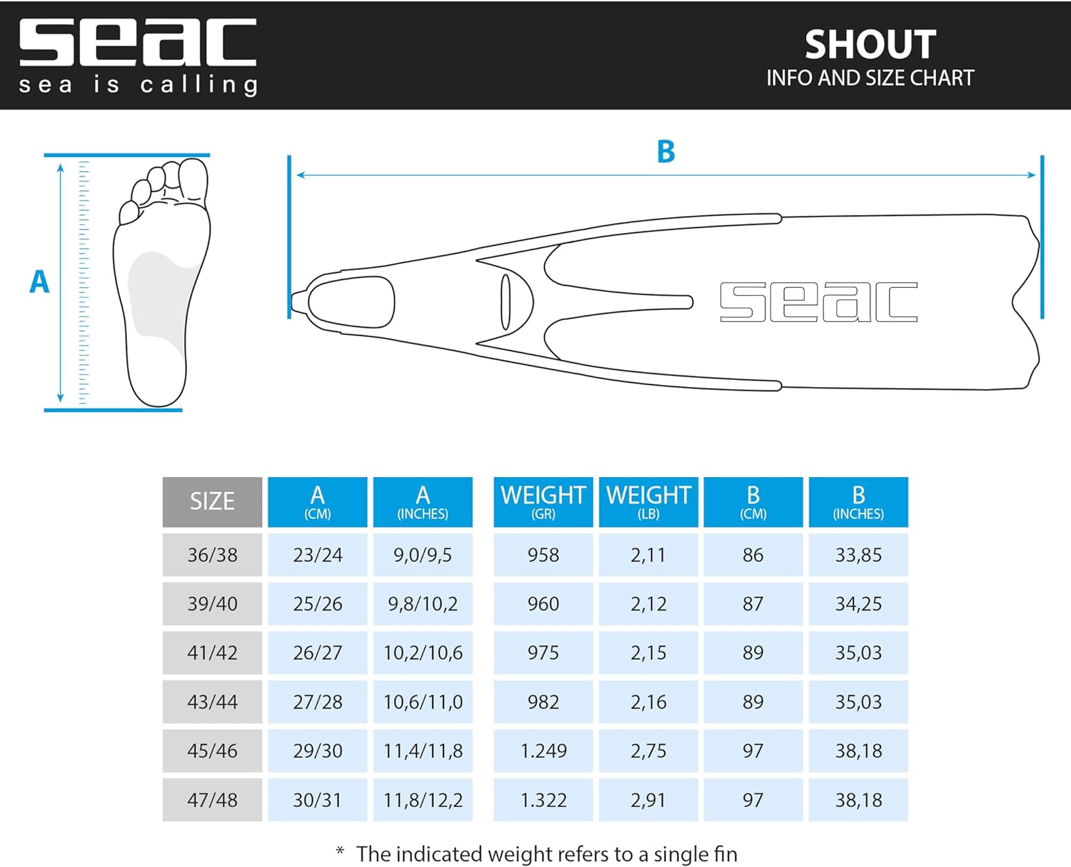 - ABMESSUNGEN UND GRÖSSEN: Die Freitauchflossen Seac Shout sind in 5 Grössen lieferbar. Die kleinste Grösse wiegt 1kg und ist 88cm lang, die grösste wiegt 1,24 kg und ist 1m lang.