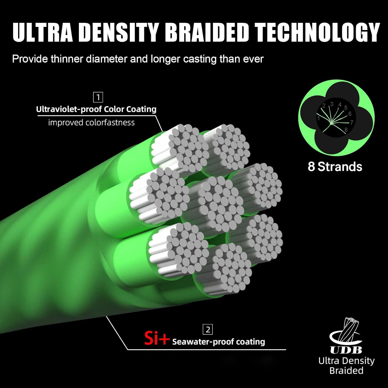 • 8 geflochtene PE-Stränge – die UHMWPE-Faser verleiht der Angelschnur seine extrem hohe Belastbarkeit. Die verbesserte Weitwinkel-Technologie macht die Angelschnur runder und verhindert so das Verheddern.