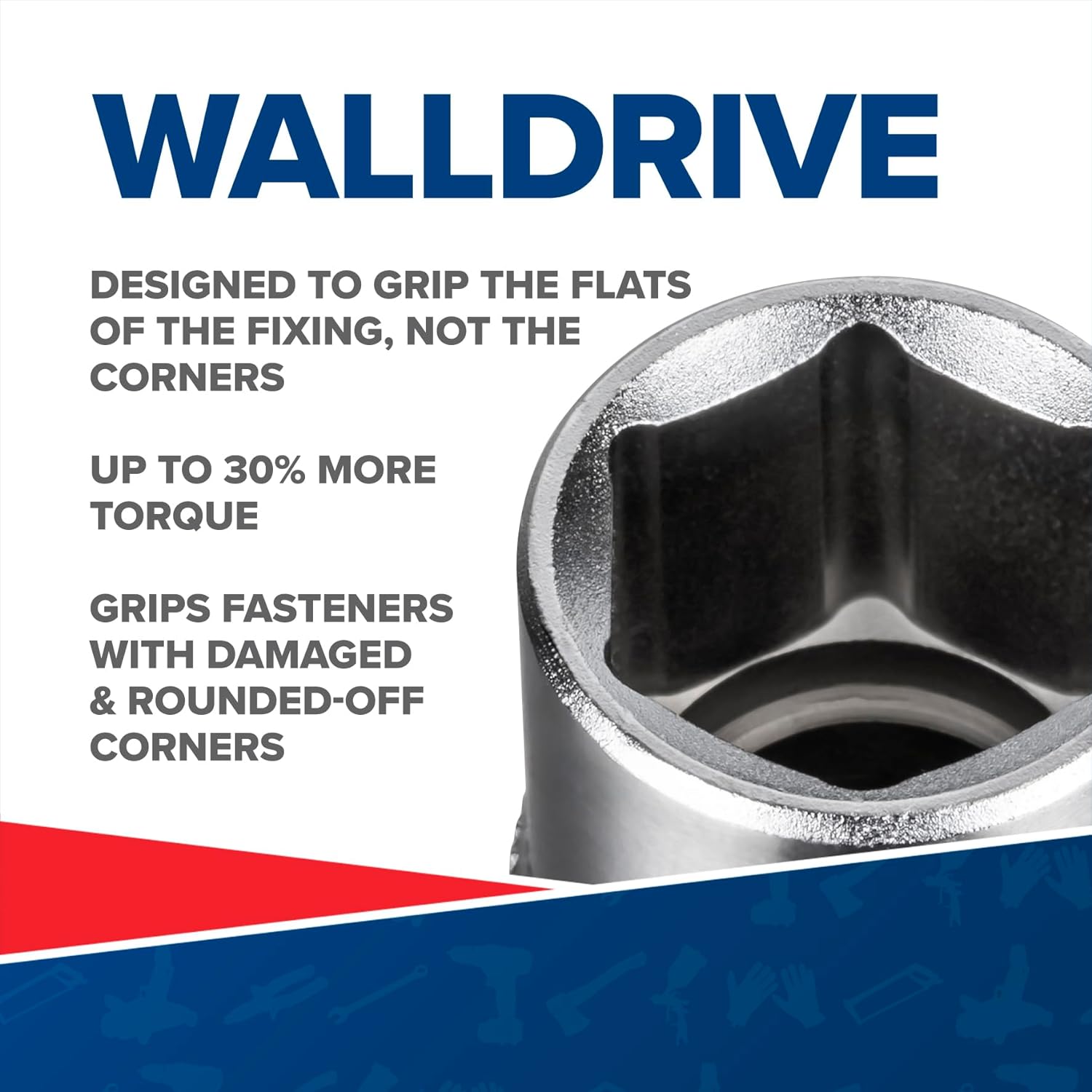 - Standardtiefe 6-Punkt-WallDrive-Stecknüsse ermöglichen eine Übertragung von bis zu 30% mehr Drehmoment auf die Befestigung.