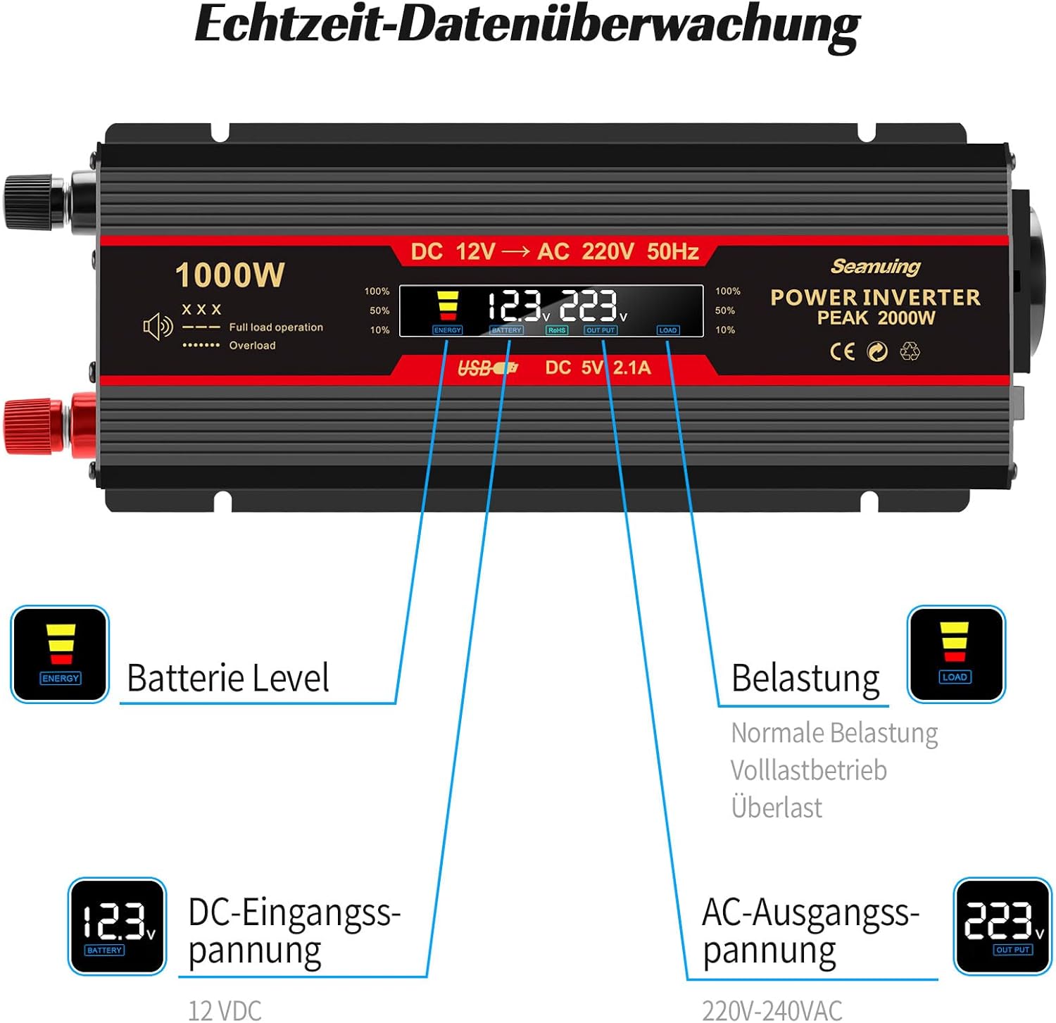 Seamuing 2000W Wechselrichter DC 12V auf AC 240V Spannungswandler 1 AC Steckdose & 2 USB Port Stromw