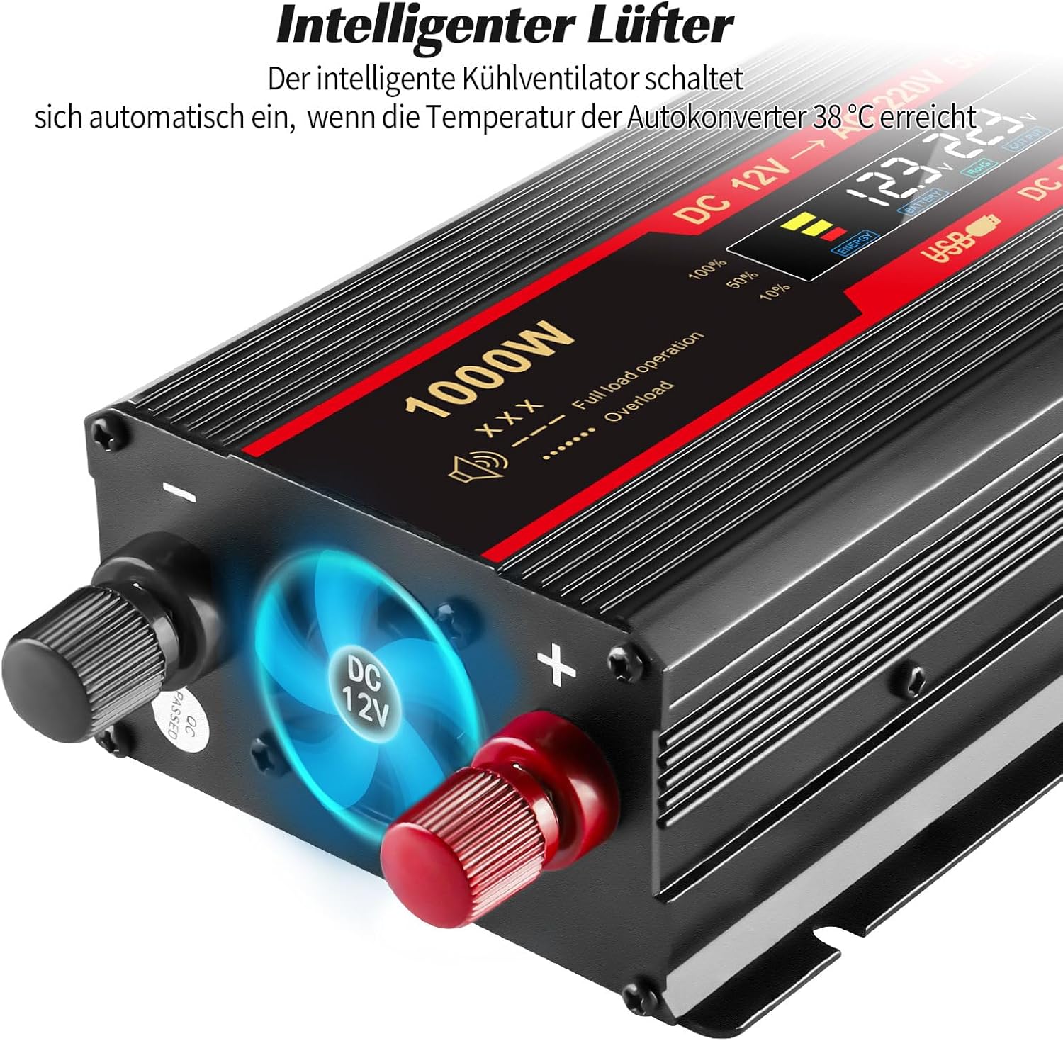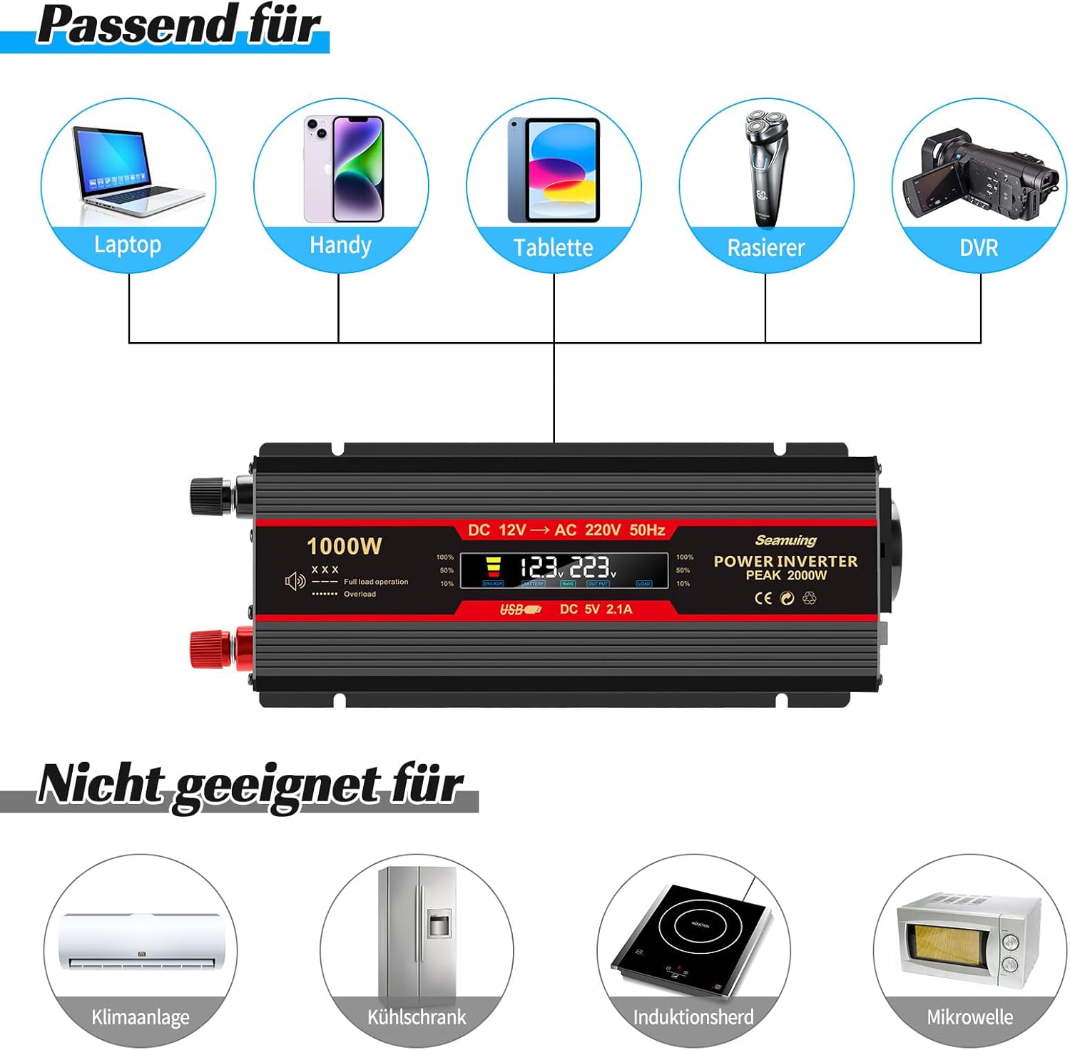 • 2 Wege Eingang: Wenn sie beim camping, können sie stromwandler an die 12V batterie anschliessen, es wird bis zu 1000W dauerleistung und 2000W (