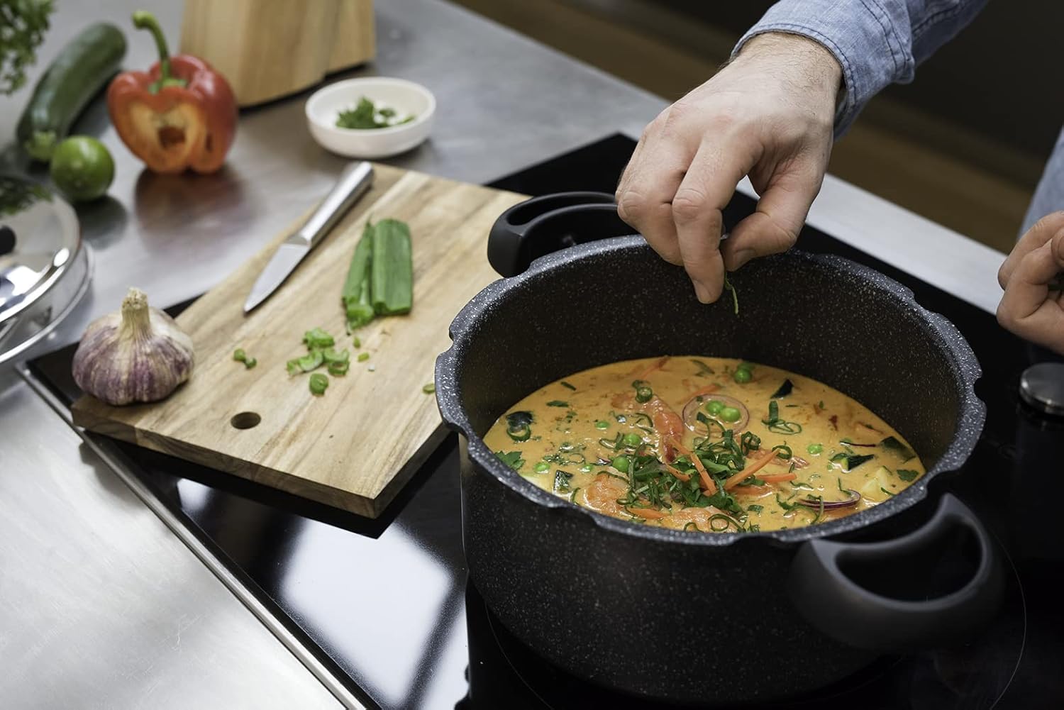 • Ultra widerstandsfähig und leicht zu reinigen dank seiner Antihaftbeschichtung mit Steinoberfläche, angereichert mit Titanpartikeln und Mineralien
