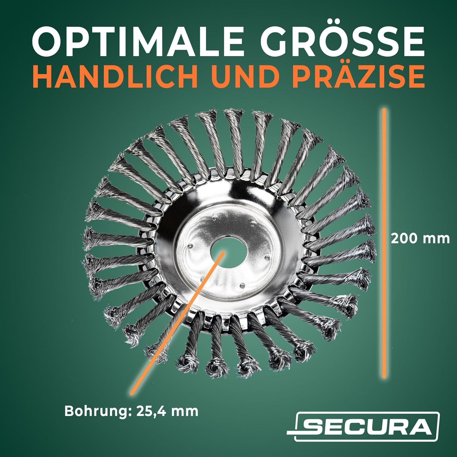 - Universelle Kompatibilität: Mit einem Durchmesser von 200 mm und einer Bohrung von 25,4 mm passt die Bürste zu 99 % der gängigen Motorsense