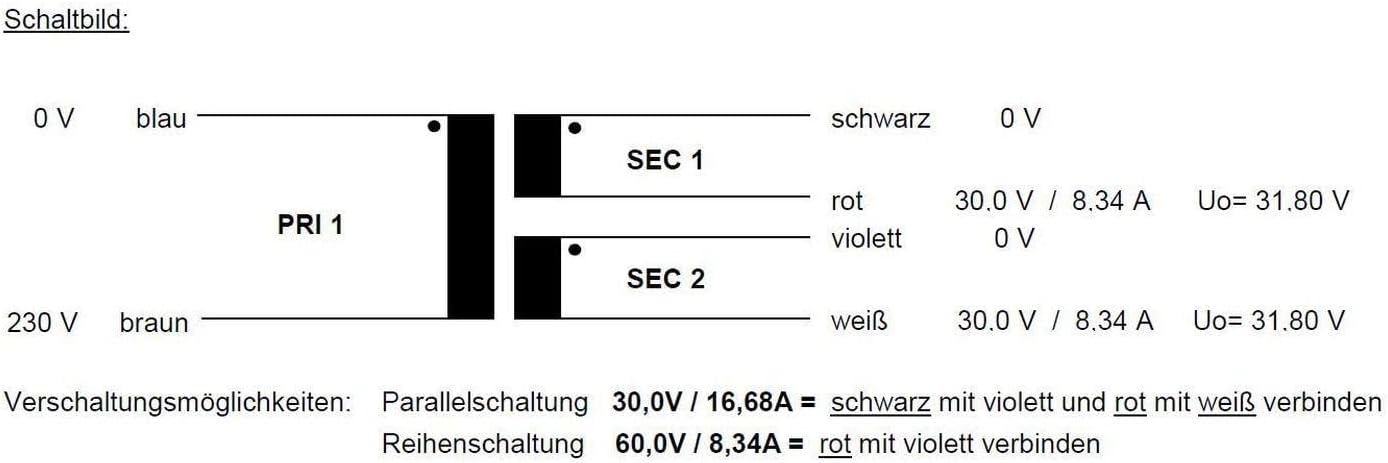 - LEISTUNG: Unsere Ringkerntransformatoren bieten Leistungen von 30 VA bis 2000 VA. Die Sekundärspannung beträgt 2x30V = 60V, der Ausgangsstrom: 2x8,34A, die Leistung 500VA sowie die Eingangsspannung: 230V (50/60Hz).