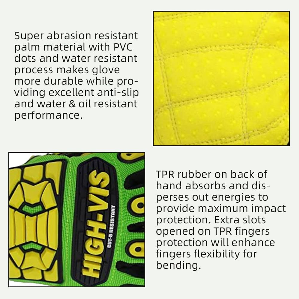 - Additional Features: Reflective tape on the wrist, One-Piece Palm with dual Kevlar threads stitching, Extended neoprene cuff, HIGH-VIS palm and back of hand