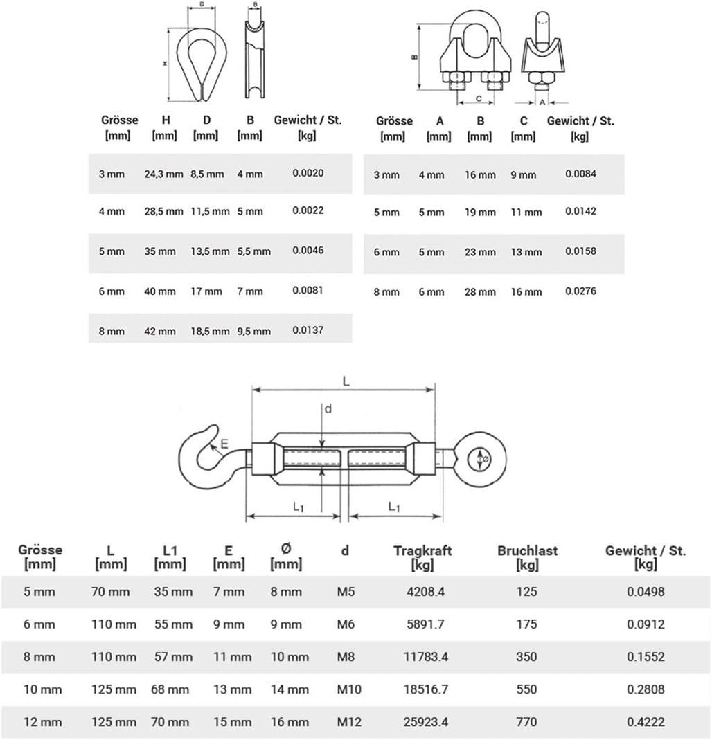 - Lieferumfang: Drahtseil 5mm 6x7 verzinkt, 2x Spannschloss M8 Haken+Öse, 8x Kausche, 8x Bügelformklemme - SET 5