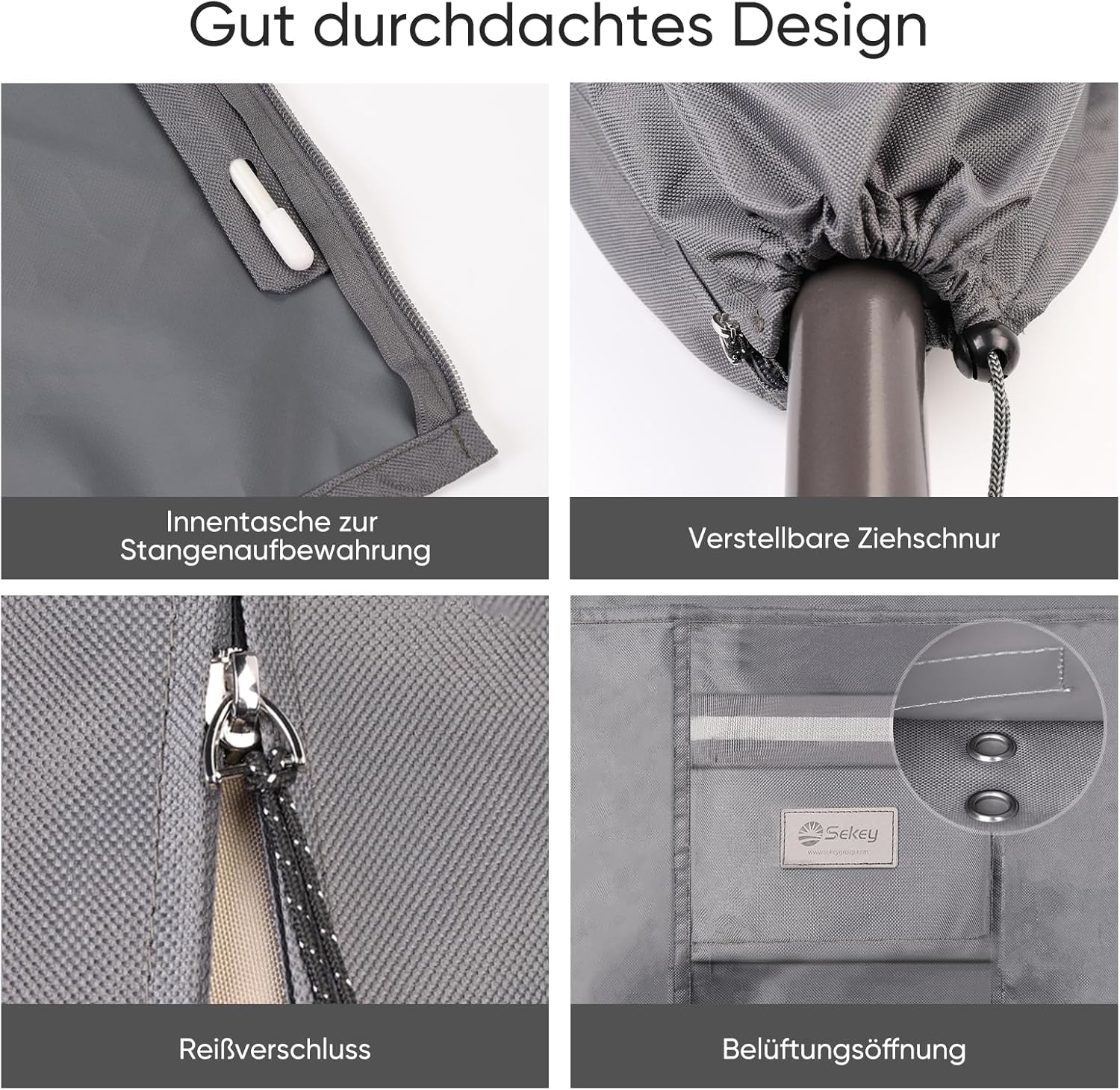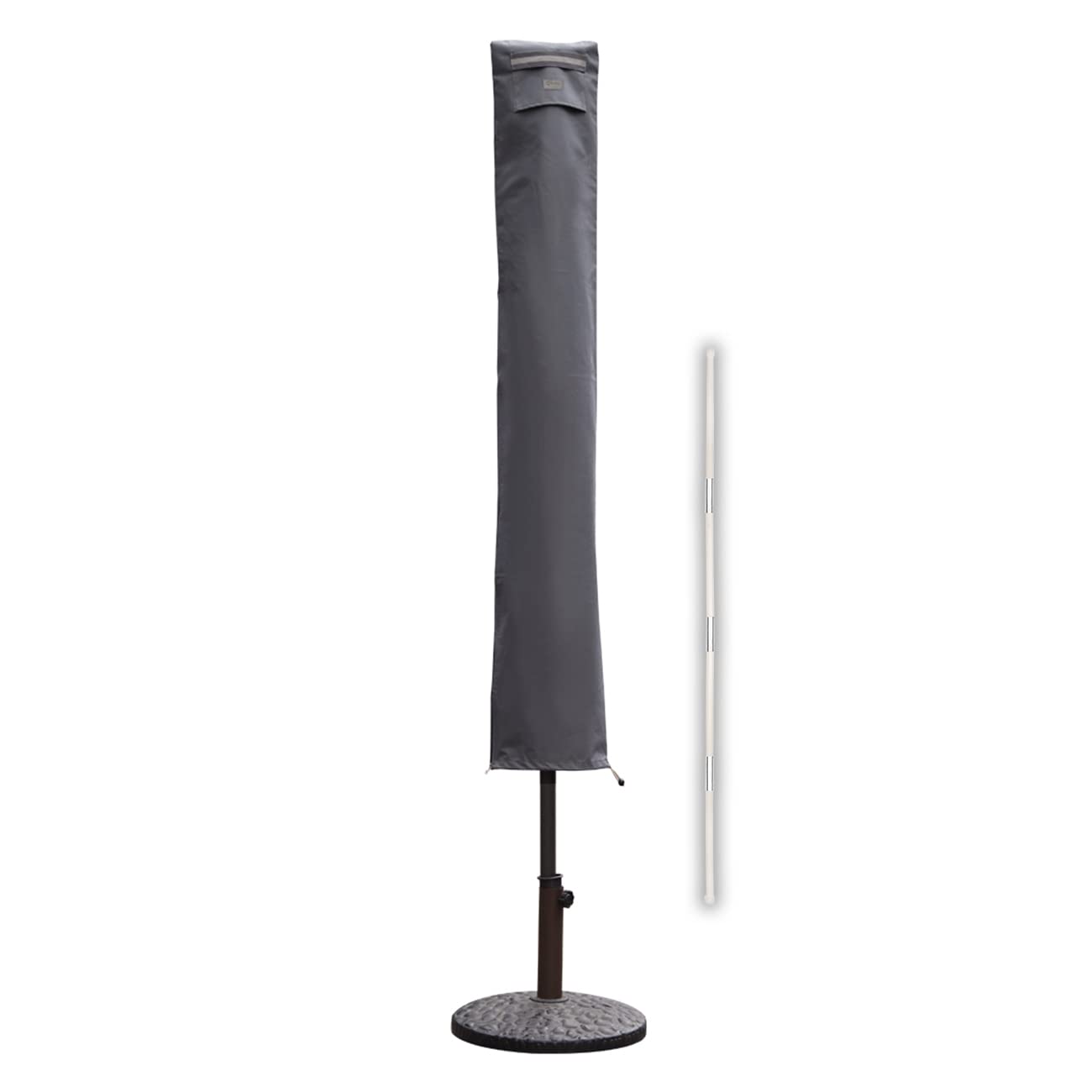 • Mit Stab und Reissverschluss, zum einfacheren Überziehen über den stehenden Schirm;