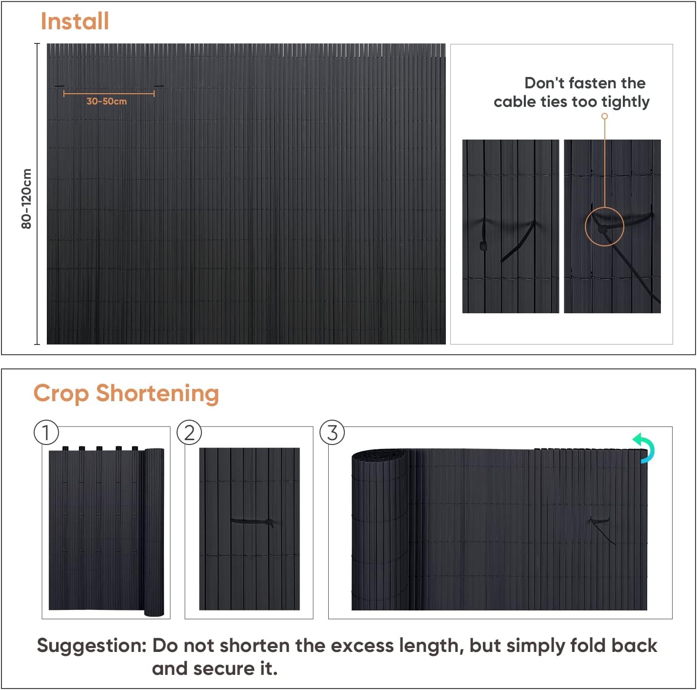 - 【Einfach zu Installieren & zu Kürzen】Balkon Sichtschutz muss keine Löcher gestanzt werden und wird mit Bändern geliefert (beim Anbringen nicht zu fest binden). Kann beliebig gekürzt werden (falls nicht notwendig, empfiehlt es sich, die Länge