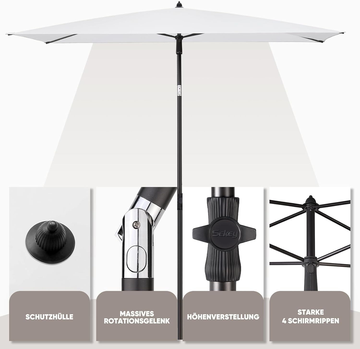 - Der Sonnenschirm besteht aus einem robusten Stahlrahmen mit 4 Gräten, die für Stabilität sorgen.