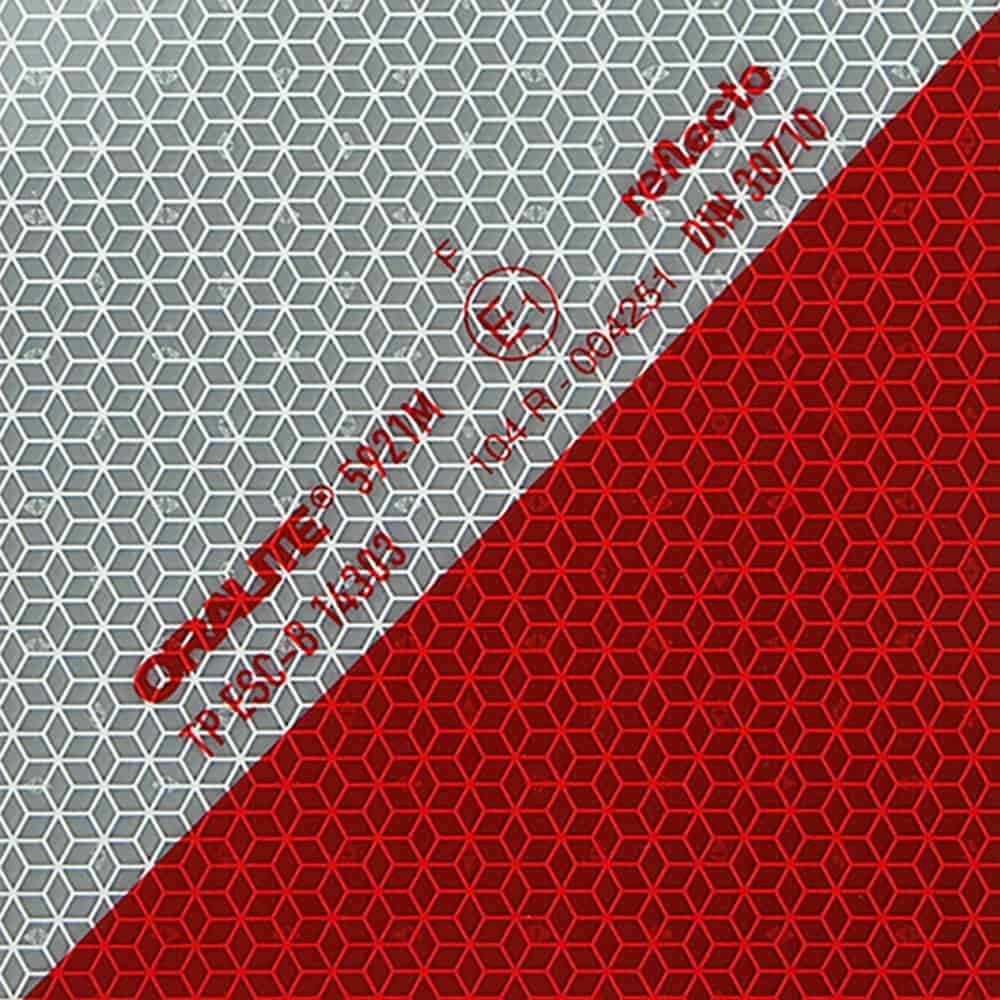 - rot-weisse mikroprismatische Reflexfolie mit zuverlässiger Rückstrahlung der Reflexionsklasse RA2/C
