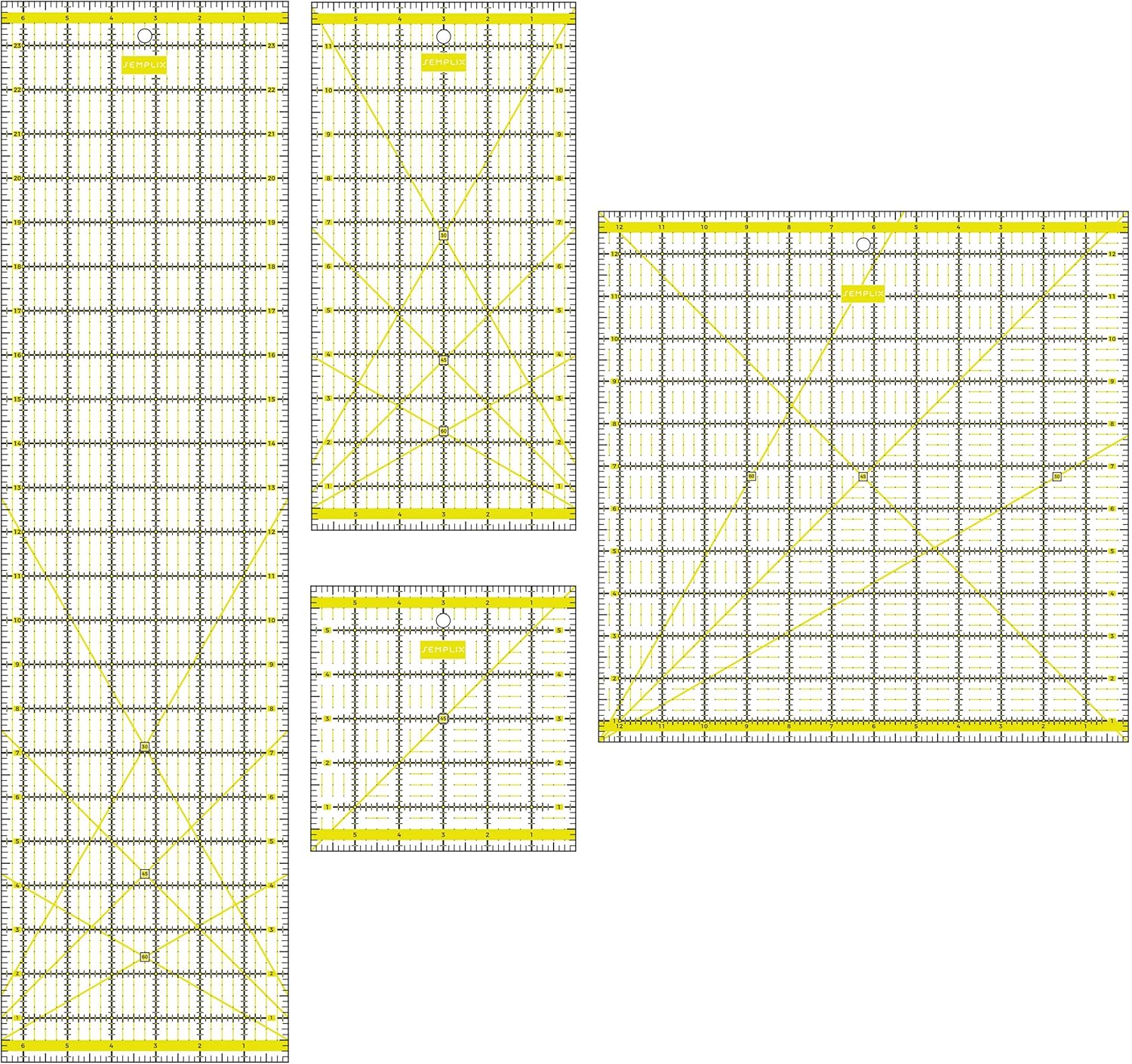 - Lieferumfang: Patchwork Lineale 6 x 6 inch, 12 x 6 inch, 24 x 6,5 inch, 12,5 x 12,5 inch | Farben: gelb, pink, türkis, lila