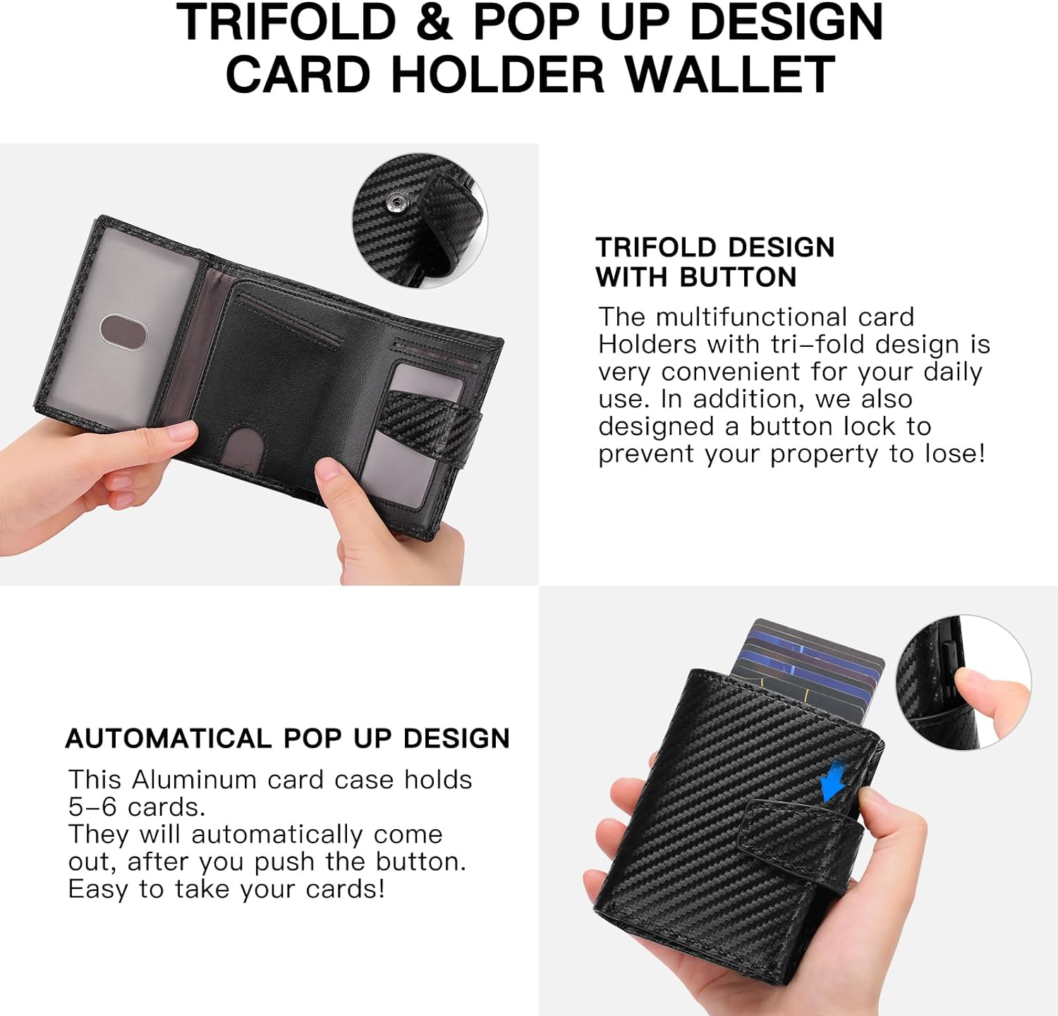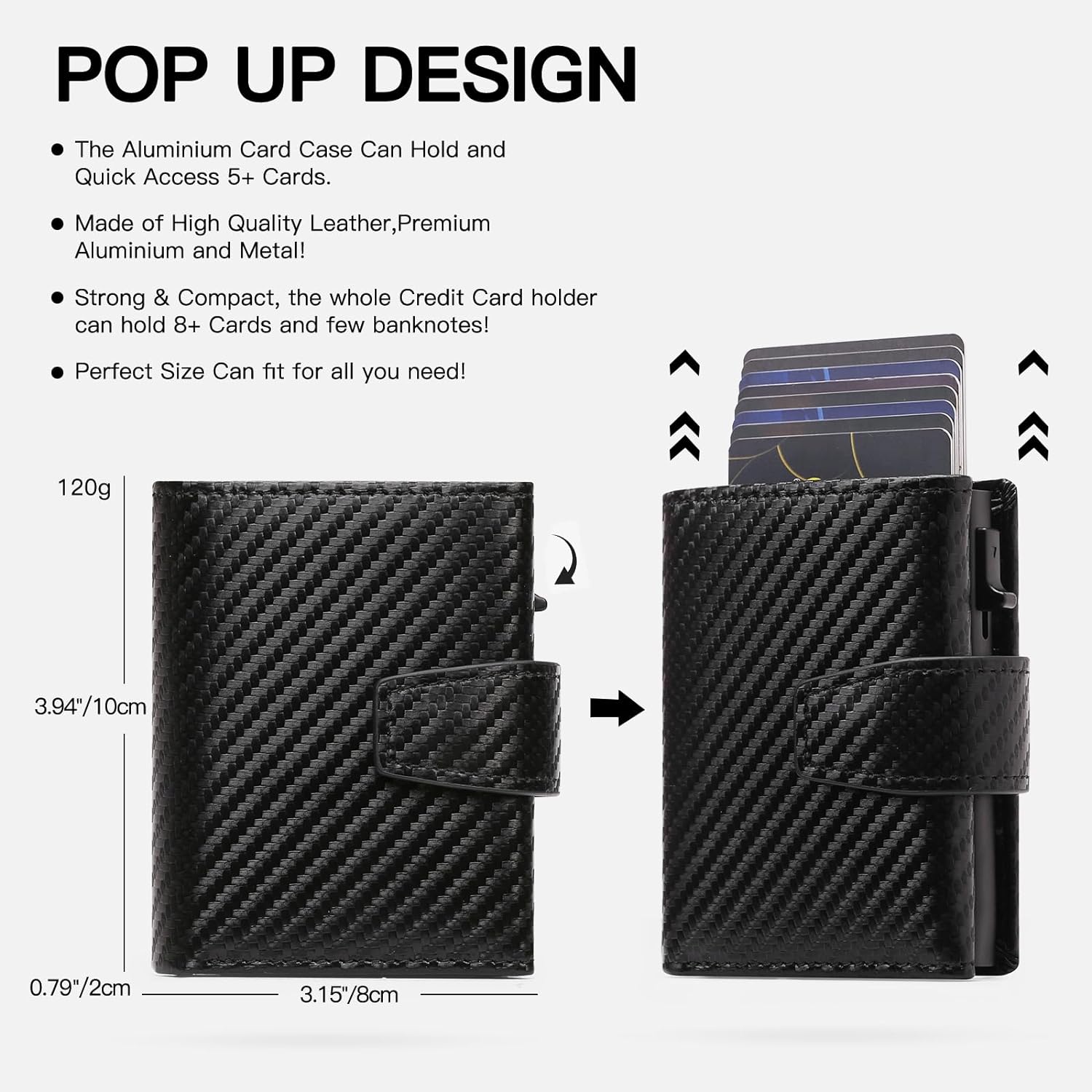 - 【Bequeme Kartenportmonee herrenentnahme】Das Geldbeutel Herren verfügt über ein Pop-up-Design, drücken Sie den Schiebeabzieher, um die Karte schnell zu entfernen, ohne die Brieftasche zu öffnen. Das Kartenetui ist aus hartem und dickem Aluminium