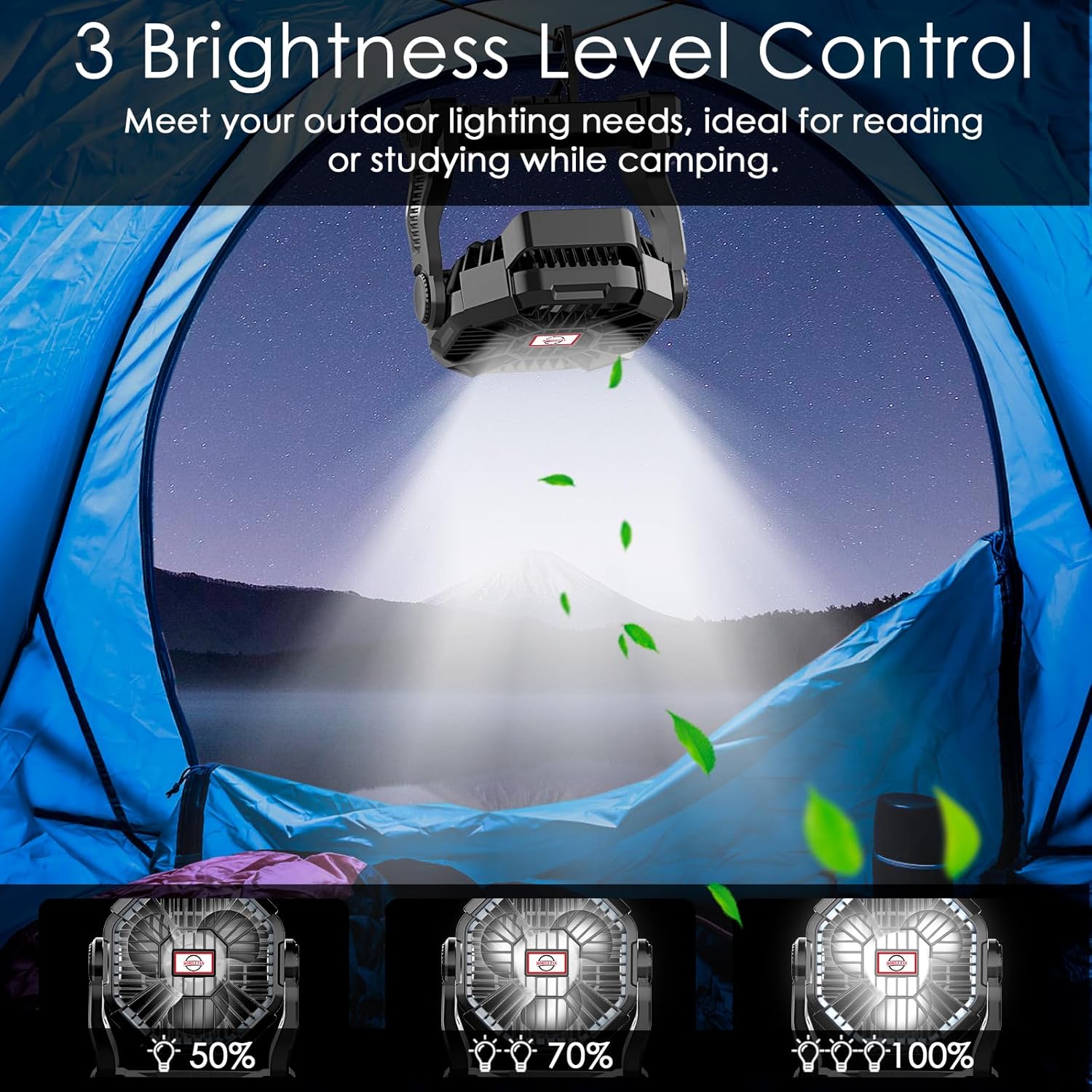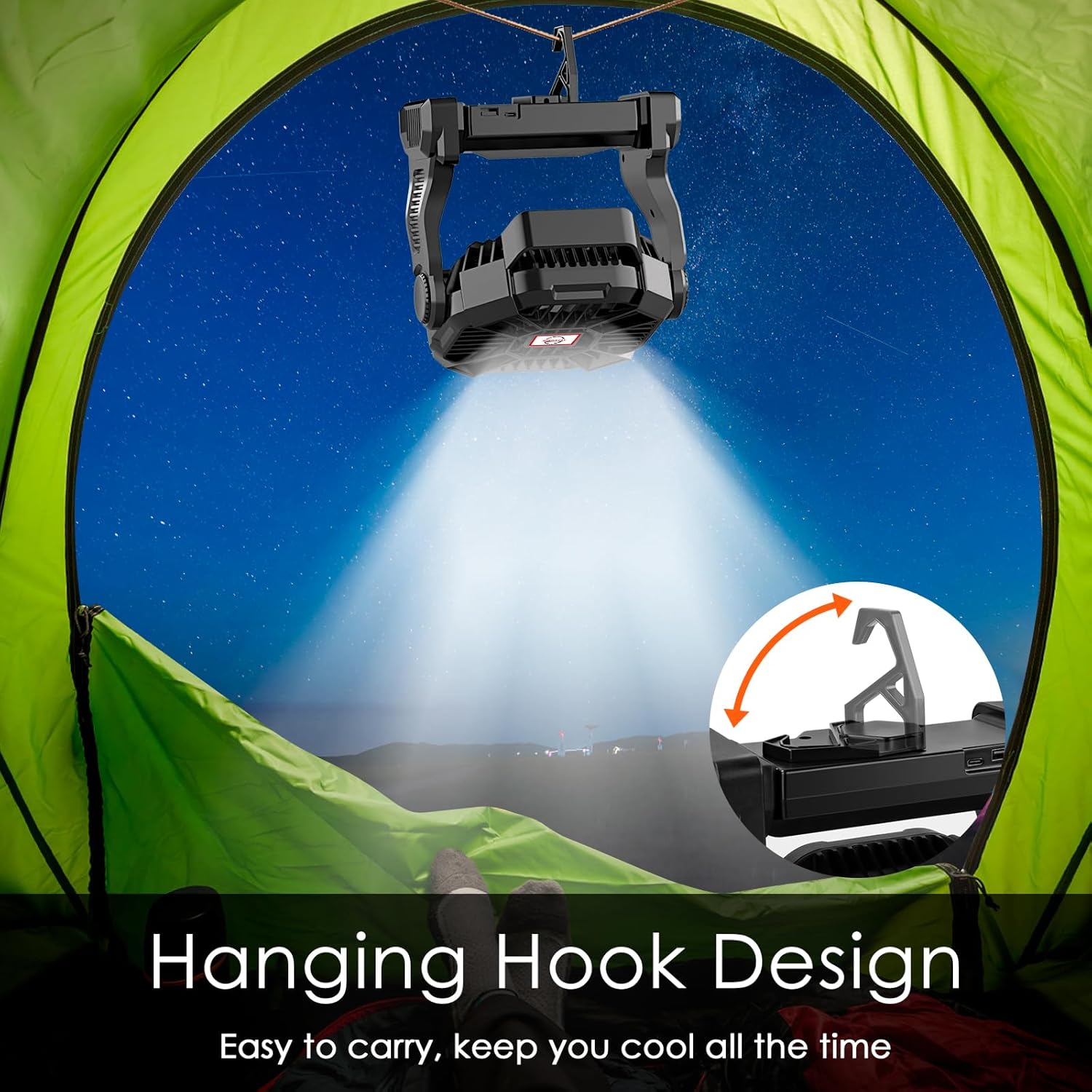 - 【3-stufige LED-Lichteinstellung】Der camping ventilator ist mit 3 stufen heller LED-leuchten ausgestattet, die minimale helligkeit ist sanft und nicht grell, praktisch für camping, wandern, angeln und andere outdoor-aktivitäten.