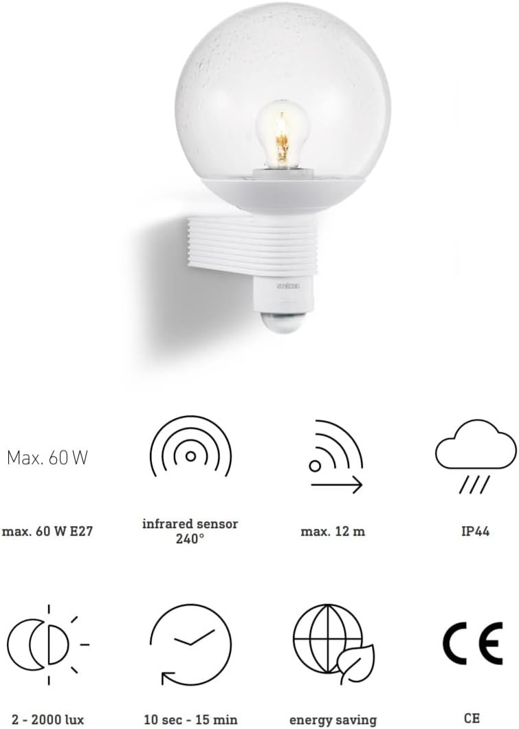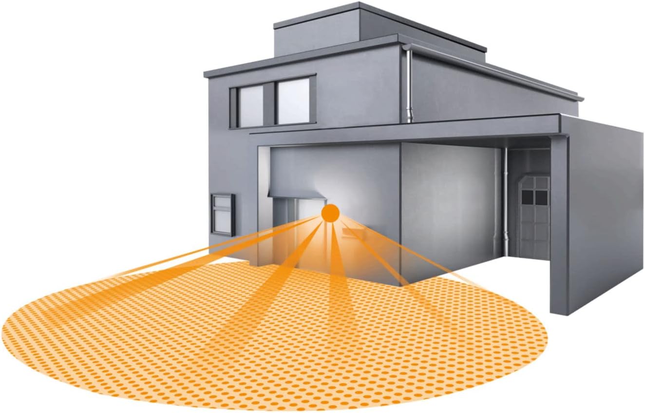 - Der Passiv-Infrarot Bewegungssensor hat einen 180° Erfassungswinkel und max. 12 m Reichweite, Nachlaufzeit (5 s – 15 Min.) und Dämmerungssensor (2 – 2000 lx) sind einstellbar