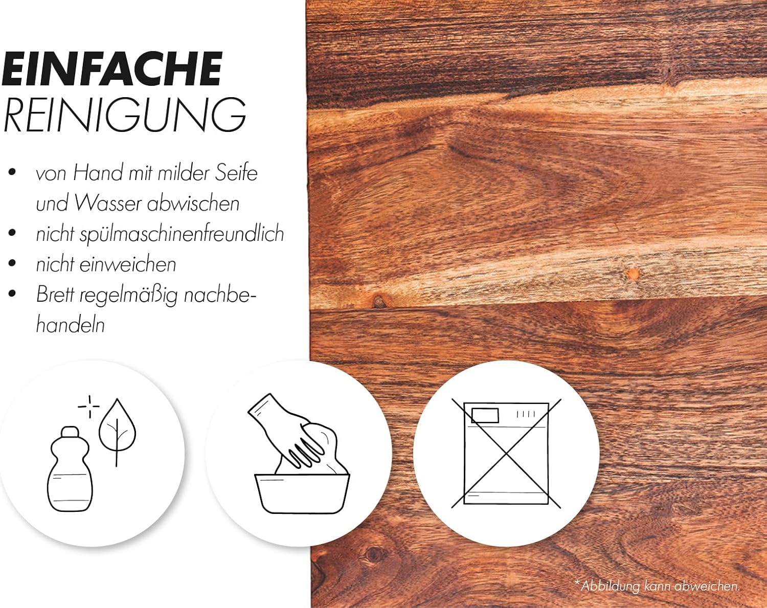 - Das Küchenbrett nicht in der Spülmaschine reinigen, sondern nur von Hand mit milder Seife und Wasser abwischen und gründlich trocknen.