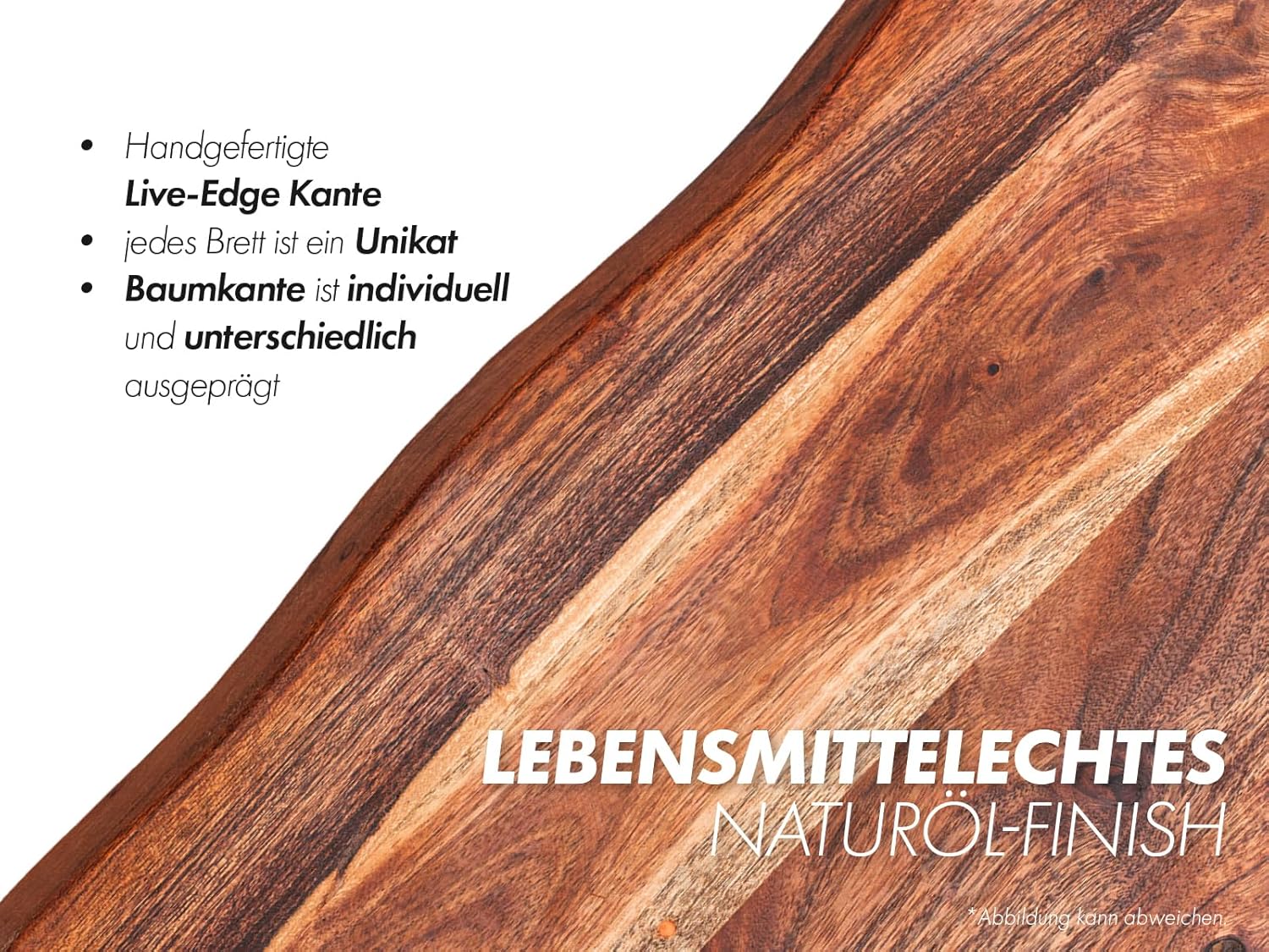 - Jedes Brett ist ein Unikat. Es kann zu geringen Massabweichungen kommen und die Baumkanten sind individuell und nicht gleich dem Angebotsbild.