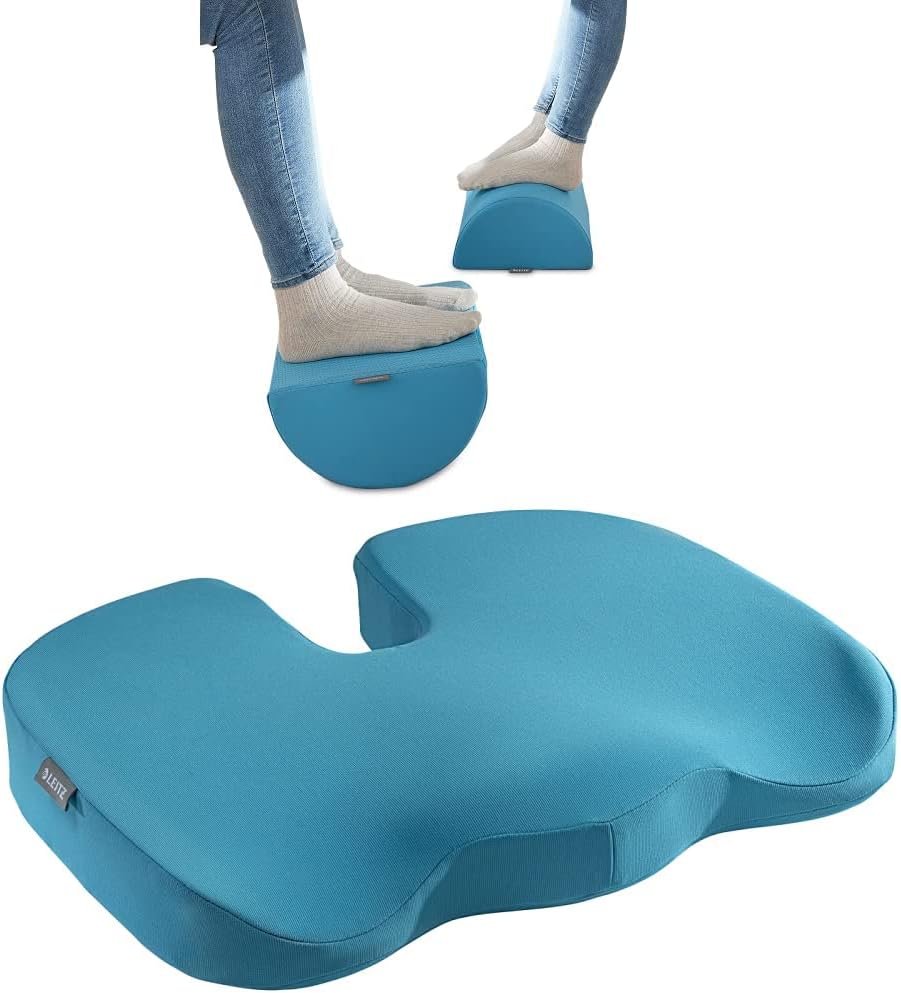 - Lieferumfang: Set 1 x Leitz Schreibtisch-Fussstütze (53710061) + 1 x Leitz Schaumstoff-Sitzkissen (52840061), Masse Fussstütze: 26 x 14 x 40,5 cm, Masse Sitzkissen: 35,5 x 7,5 x 45,5 cm, Sanftes Blau, Ergo Cosy Serie