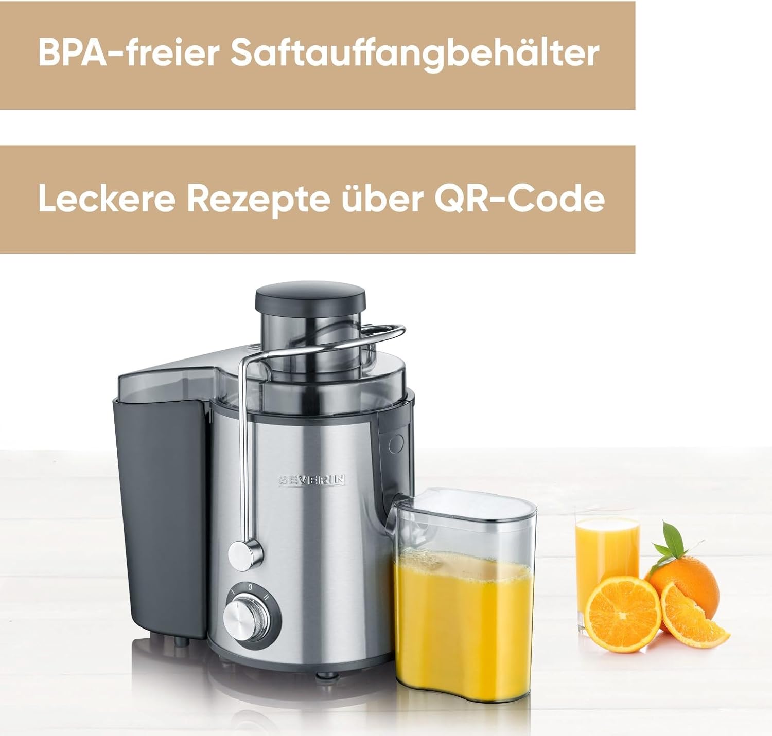 - Hochwertige Materialien – Küchenmaschine mit Edelstahl-Saftauslauf, Sieb- und Reibeinsatz aus rostfreiem Edelstahl sowie BPA-freiem Saftauffangbehälter mit 500 ml Volumen.