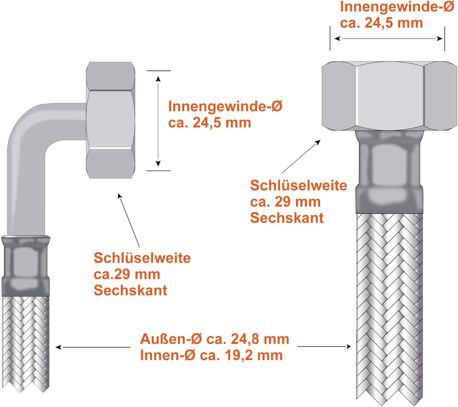 - Panzerschlauch DN19 / Flexschlauch mit Edelstahl Geflecht 1.4301, Anschlüsse: 3/4'' IG / ÜM / IG x 3/4'' ÜM / IG mit 90° Bogen