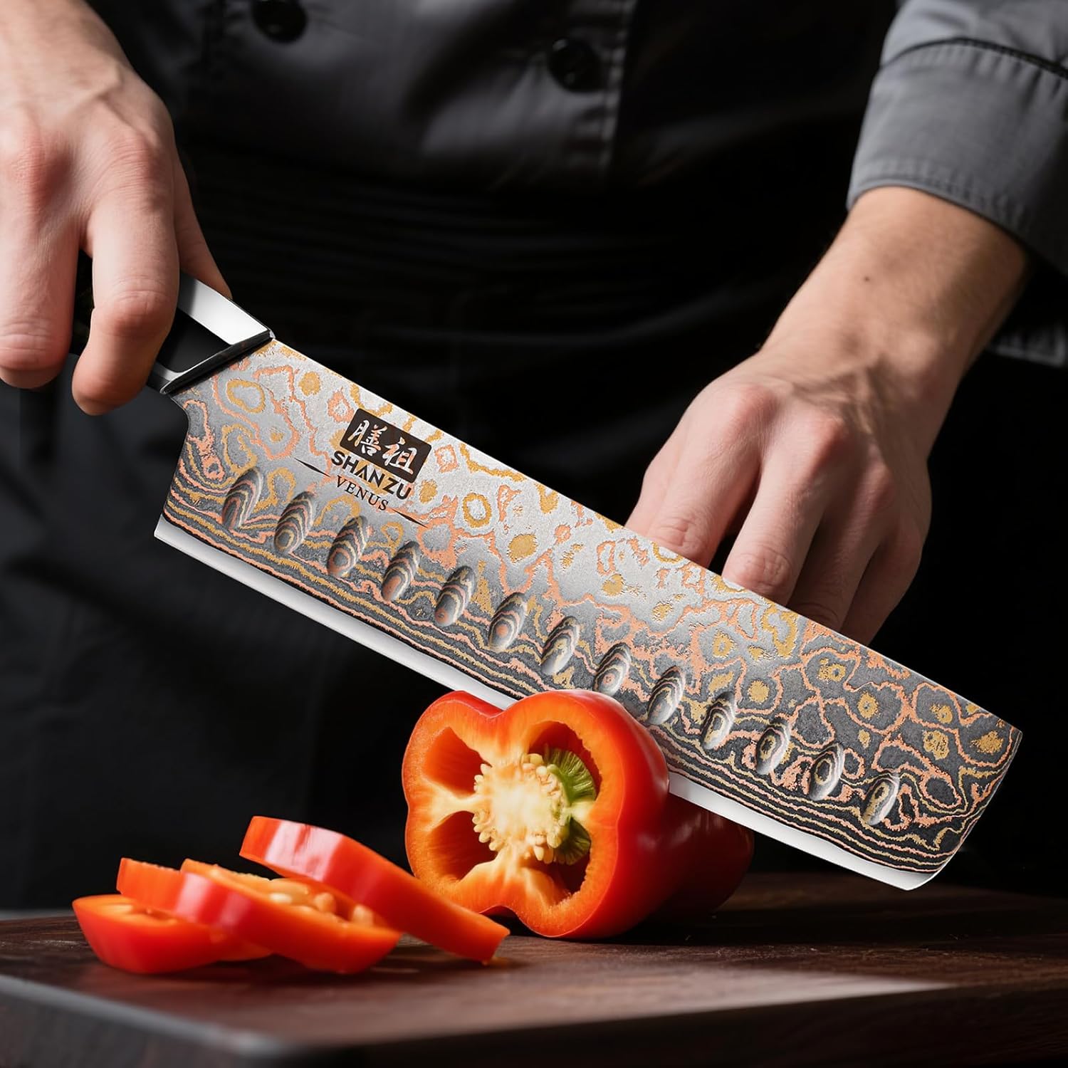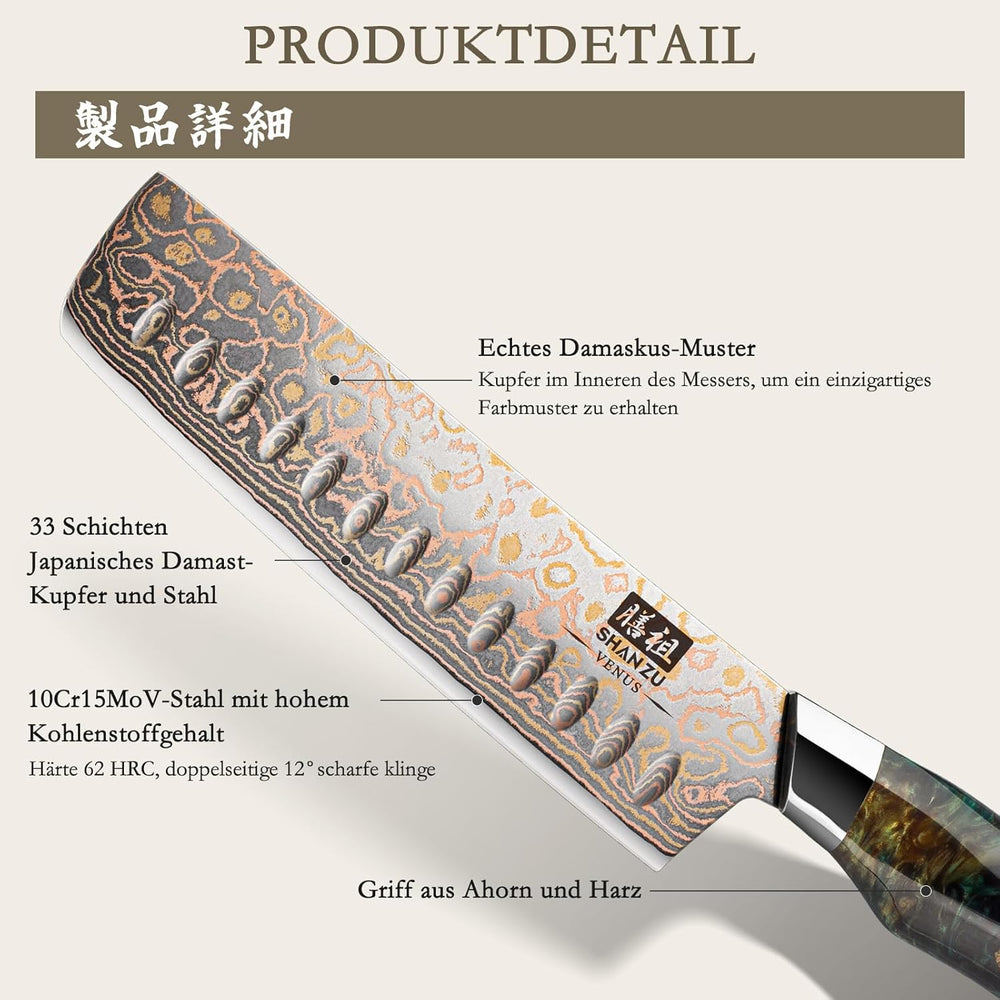 - 【Innovatives Nakiri Damastmesser mit Goldfarbenem Muster】 Bei der bezaubernden Goldmustertechnik des Profi Scharfe Damastmessers Küchenmesser von SHAN ZU werden Bleche aus Kupfer und Kohlenstoffstahl geschichtet und übermässige Wärmebehandlungen