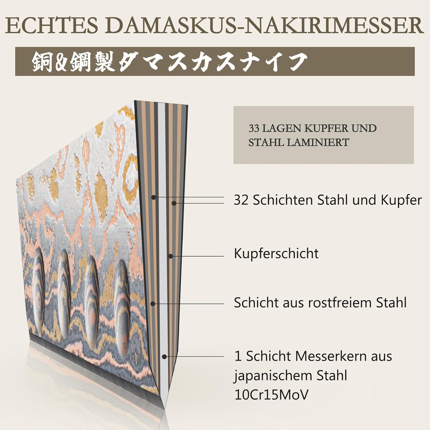- 【Geschmiedet aus 33 Schichten Kupfer und Stahl, Langlebige Verwendung】 Neben dem japanischen Messerkern sind auf der Klinge noch 32 Schichten Kupfer und Kohlenstoffstahl geschmiedet. Die Struktur mit insgesamt 33 Schichten verbessert die