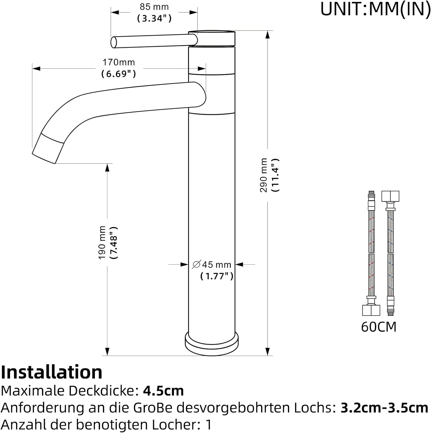 - Einfach zu installieren: Wir sind mit einem Standard G3/8 Wasserzulaufrohr mit einer Länge von 60cm ausgestattet, das sehr einfach zu installieren ist und mit einer Installationsanleitung geliefert wird.Sie müssen keinen Klempner beauftragen.